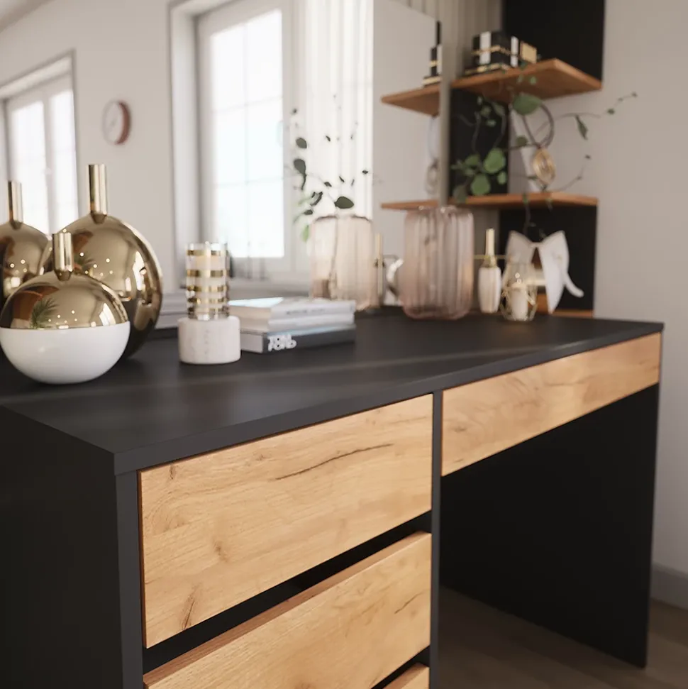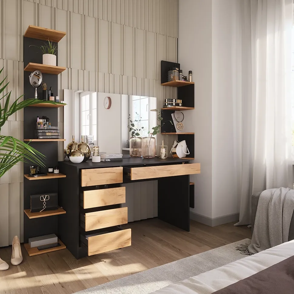 Der Sherry Schminktisch ist der perfekte Begleiter für alle Schönheitsliebhaberinnen da draußen. Mit seinen fünf geräumigen Schubladen bietet er ausreichend Platz für all Ihre Lieblingskosmetika und -accessoires. Der große rechteckige Spiegel sorgt dafür, dass Sie jedes Detail Ihres Make-ups perfektionieren können. Die robuste Konstruktion gewährleistet eine lange Haltbarkeit, während das funktionelle Design dafür sorgt, dass Sie alles stets griffbereit haben. Dieser Schminktisch ist in verschiedenen Ausführungen erhältlich, sodass Sie sicherlich das passende Modell für Ihr Zuhause finden werden. Gönnen Sie sich den Luxus eines eigenen Frisiertisches und fühlen Sie sich jeden Tag wie eine Hollywood-Diva!