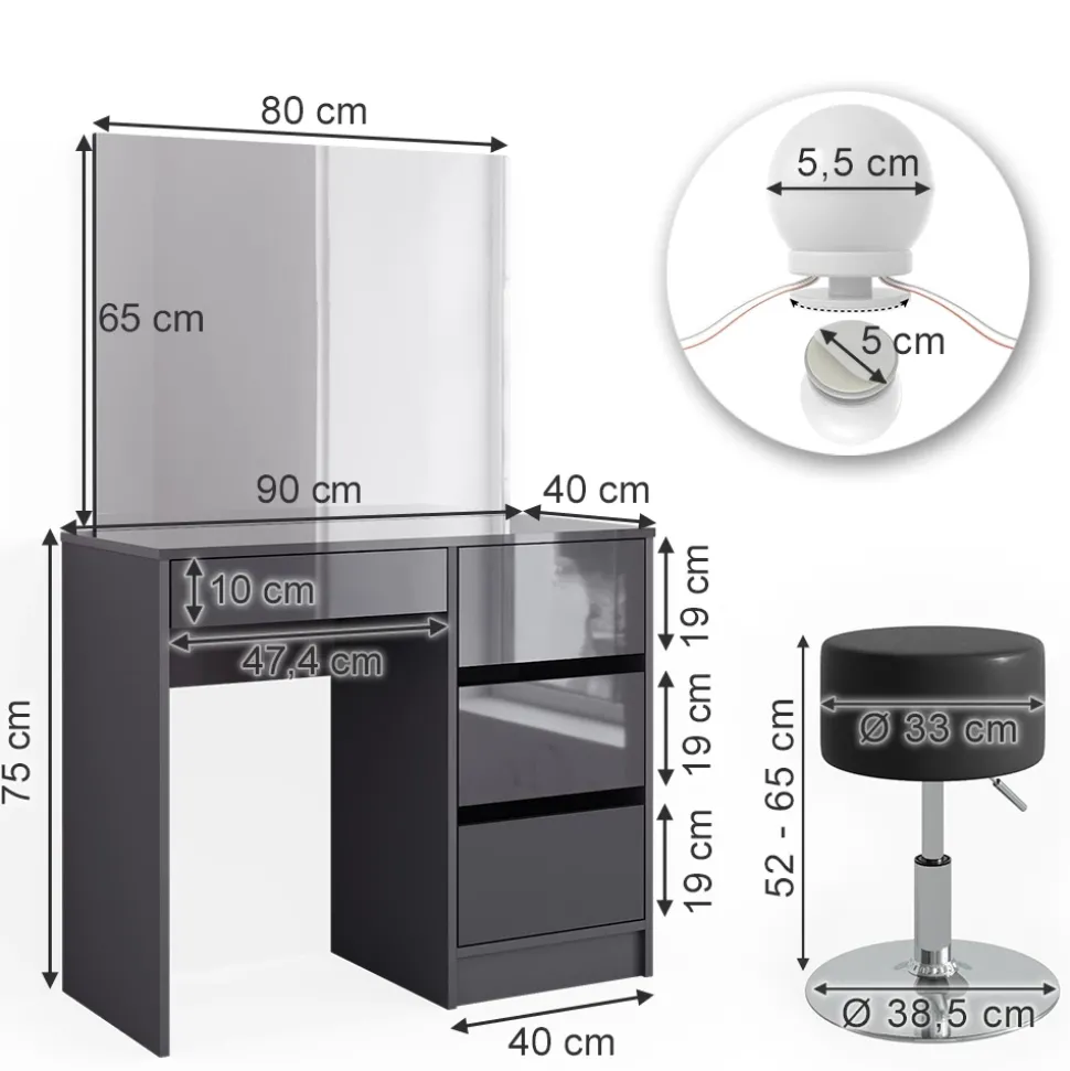 - PRODUKTMAßE: Frisiertisch: 90x75x40cm (BxHxT). Spiegel: 80x65x2cm. LED-Kette: Ø LED-Kugel 5 cm, 400 cm lang, 400 g. Hocker: 52-67cm (H), Ø Sitz: 33,5cm, Ø Fuß: 38,5cm.