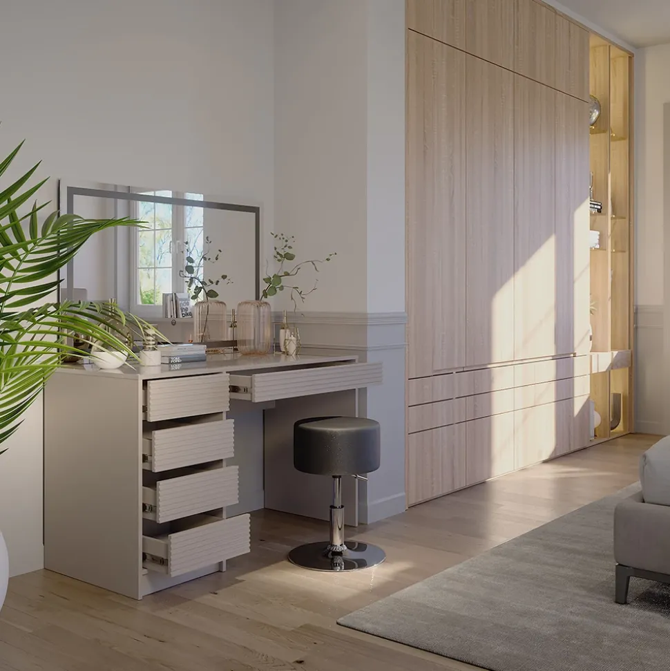 Die Möbelserie „Sherry“ umfasst Einrichtungsgegenstände für das Schlafzimmer, darunter auch Frisiertische. Mit vielen verschiedenen Optionen in verschiedenen Konfigurationen bietet sie vielseitige Gestaltungsmöglichkeiten. Verleihen Sie Ihrem Schlafzimmer mit den Möbeln der „Sherry“ Serie eine persönliche Note.