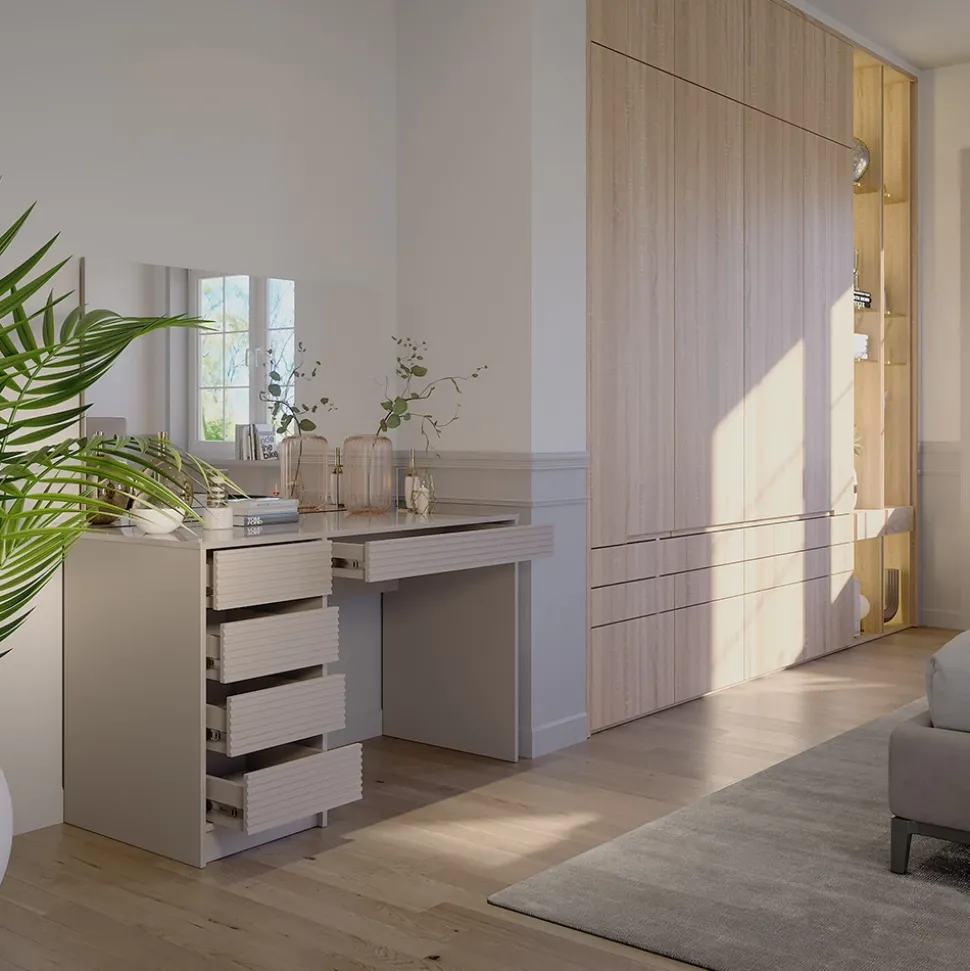 Die Möbelserie „Sherry“ umfasst Einrichtungsgegenstände für das Schlafzimmer, darunter auch Frisiertische. Mit vielen verschiedenen Optionen in verschiedenen Konfigurationen bietet sie vielseitige Gestaltungsmöglichkeiten. Verleihen Sie Ihrem Schlafzimmer mit den Möbeln der „Sherry“ Serie eine persönliche Note.
