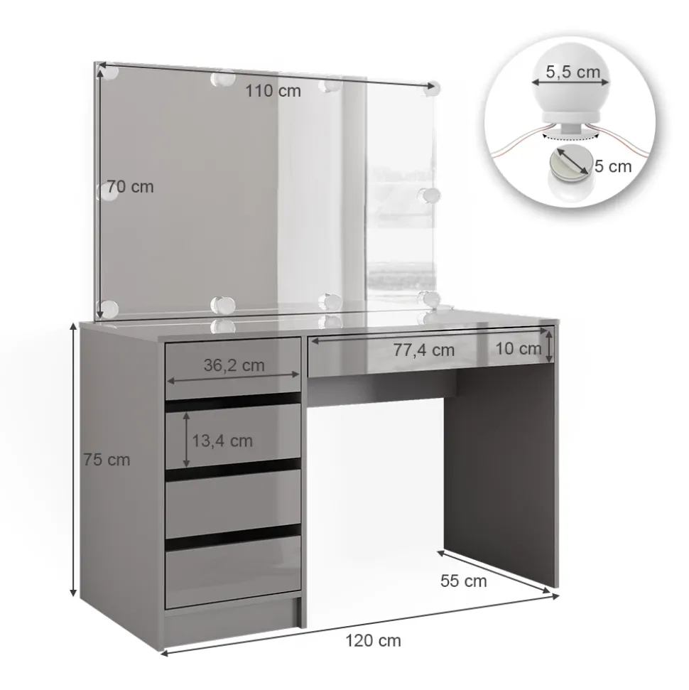 - MAßE: Der Frisiertisch hat eine Breite von 120 cm, eine Höhe von 75 cm und eine Tiefe von 55 cm. Alle detaillierten Größen sind auf den Fotos angegeben.