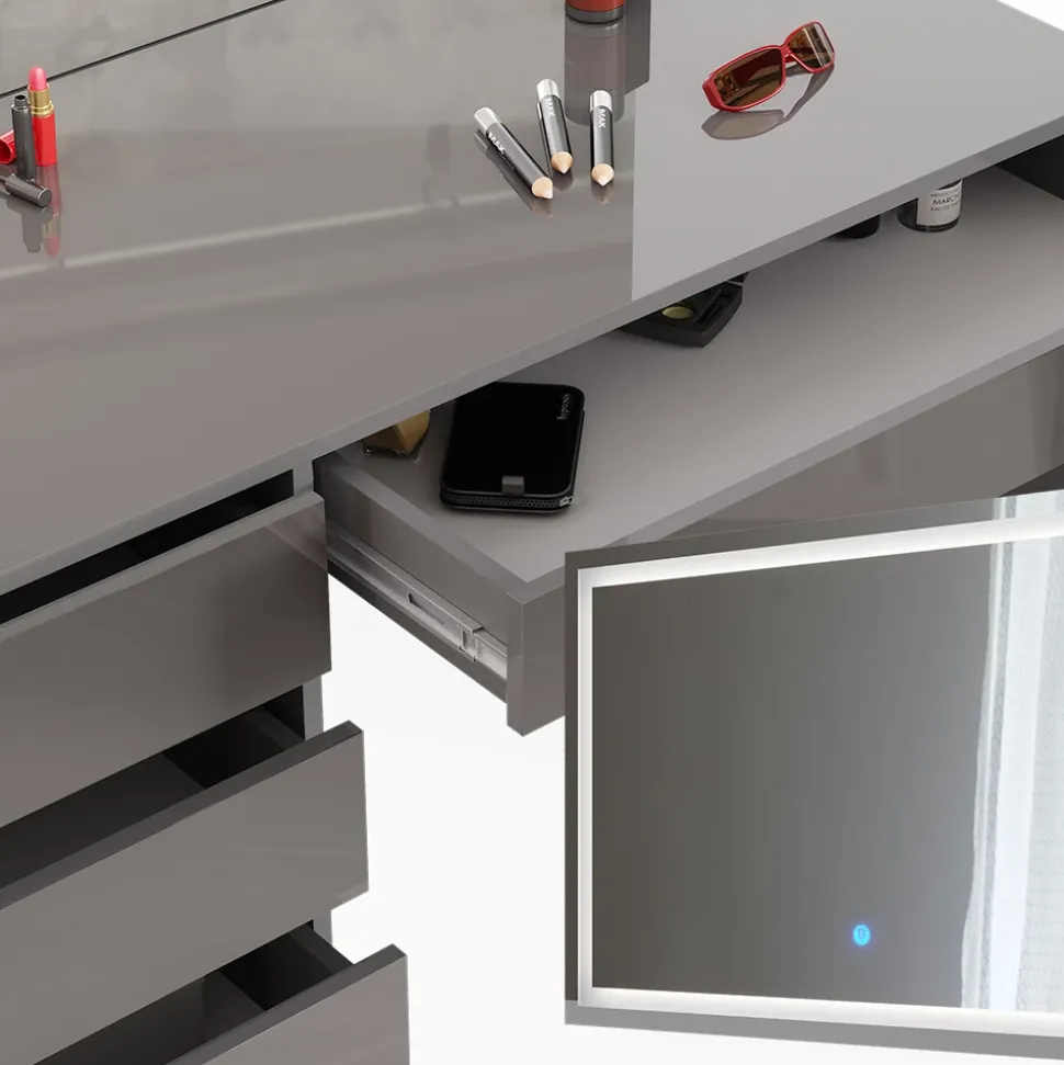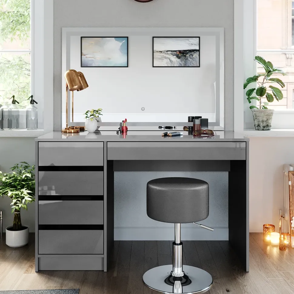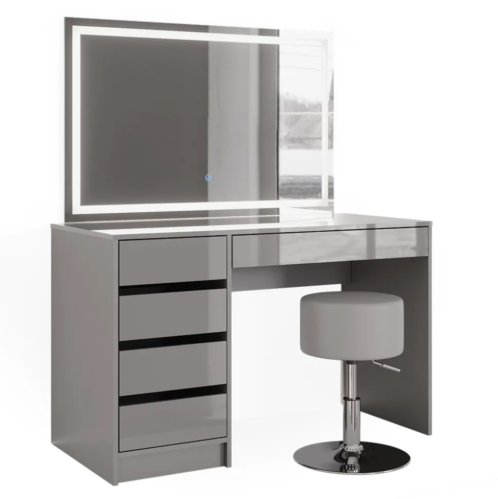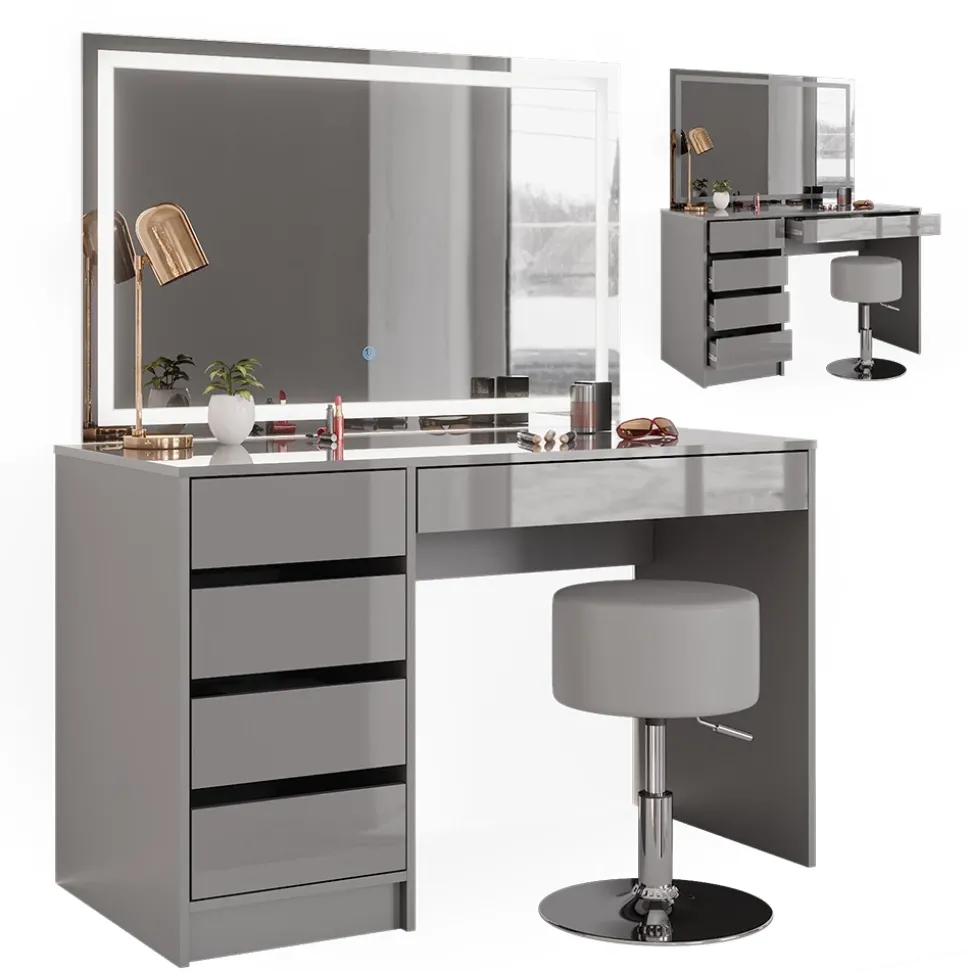 Der Schminktisch Sherry mit Hocker ist das perfekte Upgrade für Ihr Schlafzimmer oder Badezimmer. Mit seinen fünf geschlossenen Fachböden bietet dieser Frisiertisch genügend Stauraum für all Ihre Kosmetikartikel. Das funktionelle Design und die robuste Konstruktion machen ihn zu einem langlebigen Begleiter für Ihre tägliche Schönheitsroutine. Der große rechteckige LED-Spiegel ermöglicht es Ihnen, jedes Detail Ihres Make-ups perfekt zu sehen. Und das Beste ist, dass dieses Schminktischmodell in verschiedenen Ausführungen erhältlich ist, um Ihren einzigartigen Stil zu ergänzen. Ein Schminktisch wie Sherry verleiht Ihrem Zimmer eine charmante Note und lädt Sie ein, sich wie eine wahre Königin zu fühlen. Träumen Sie nicht länger von einem perfekten Schminktisch – machen Sie Sherry zu Ihrem treuen Begleiter!