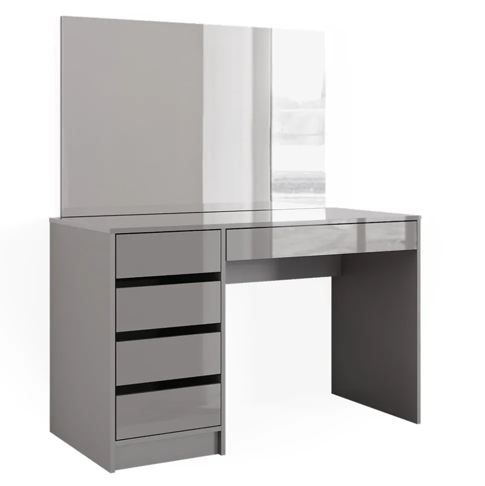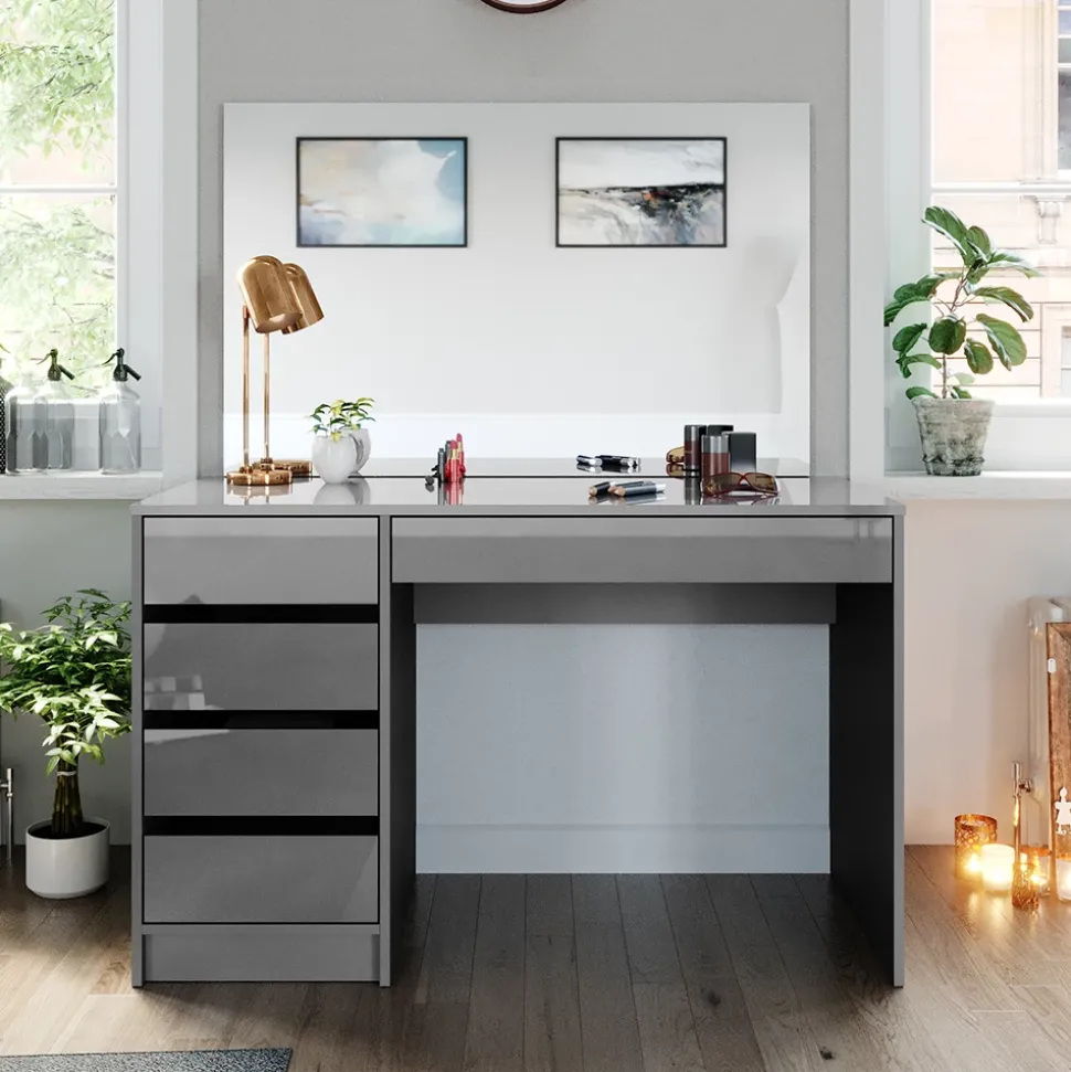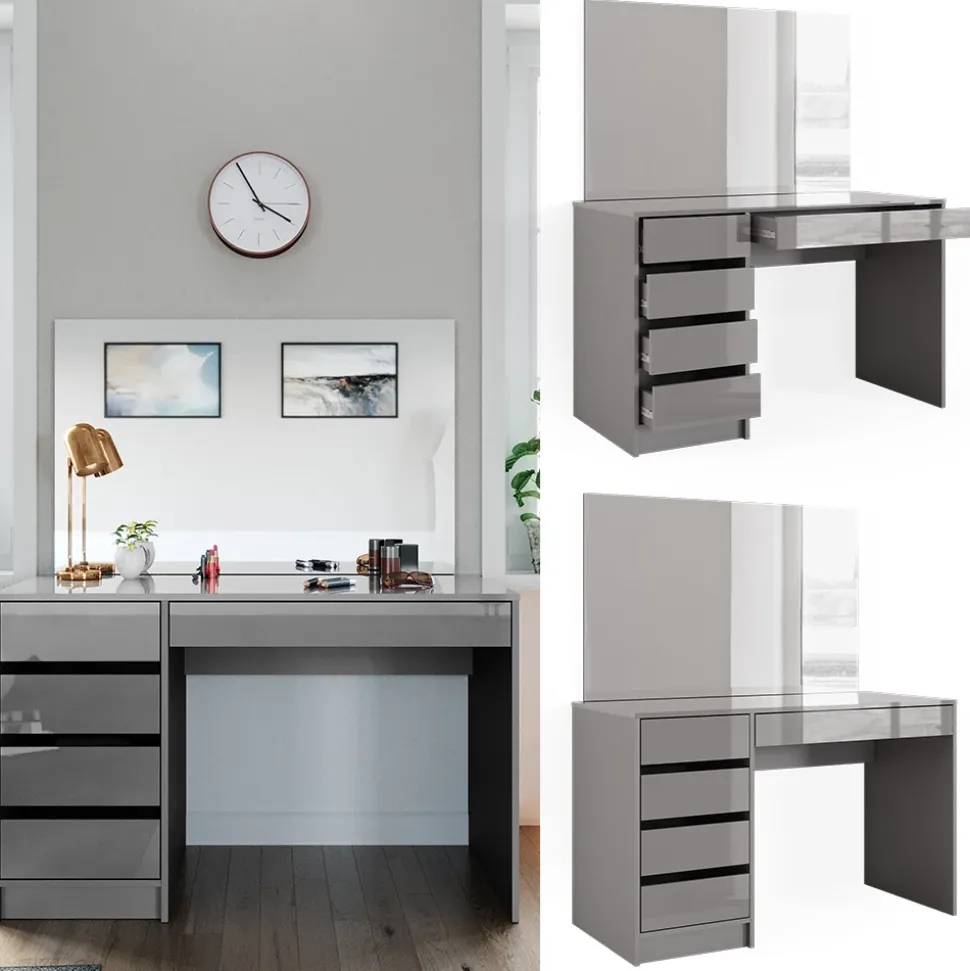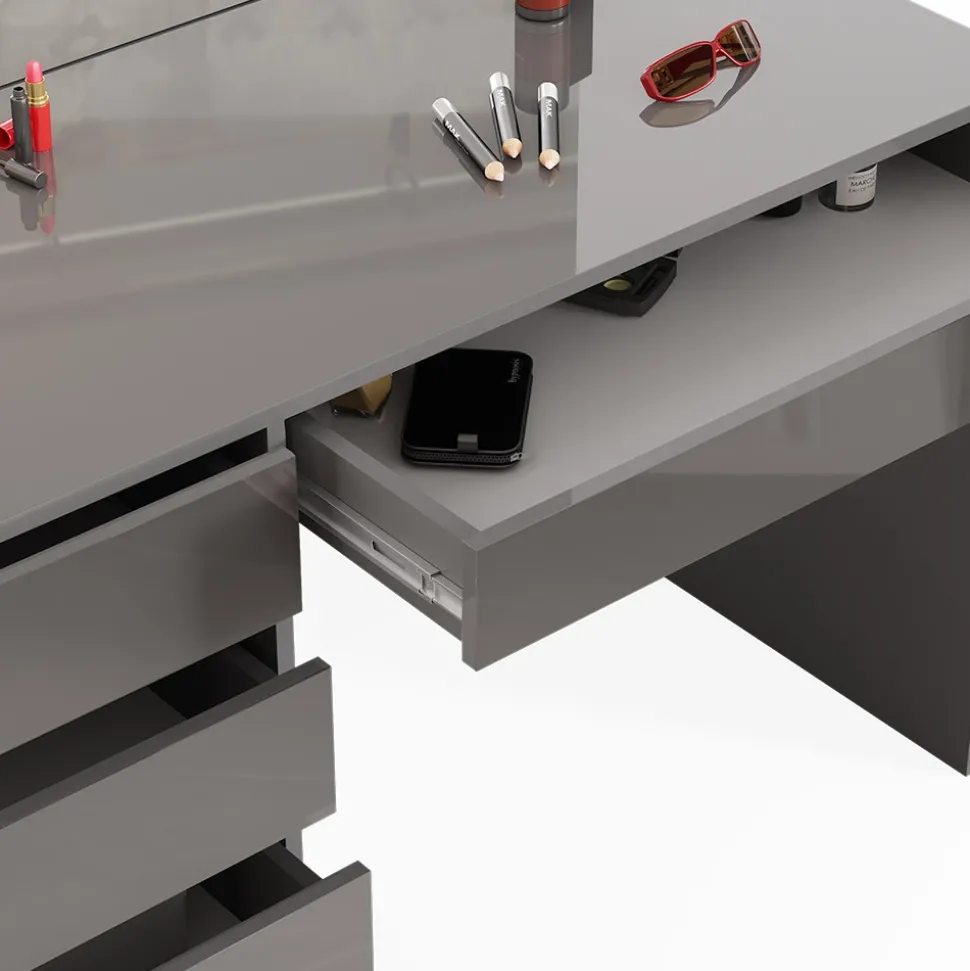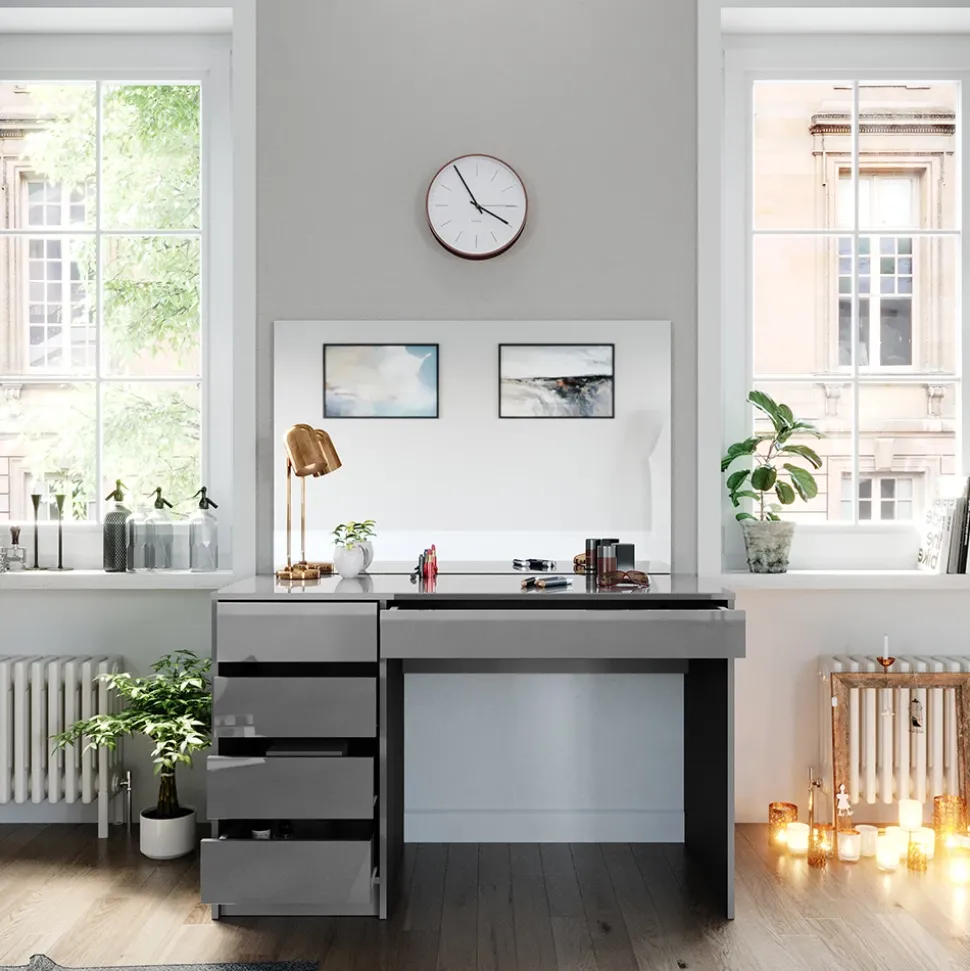 - Der Frisiertisch mit Spiegel bietet vier geschlossene Ablagen in einer robusten Konstruktion und einen großen rechteckigen Spiegel.