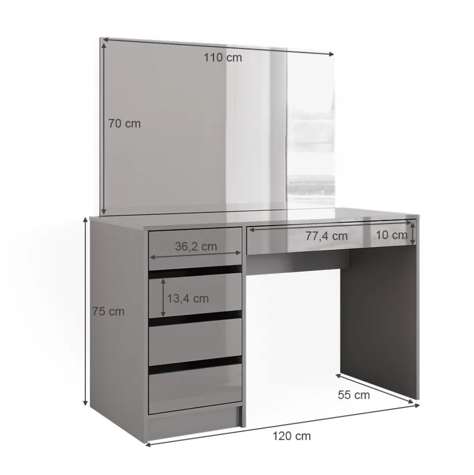 - MAßE: Der Kosmetiktisch hat eine Breite von 120 cm, eine Höhe von 75 cm und eine Tiefe von 55 cm. Alle detaillierten Größen sind auf den Fotos angegeben.