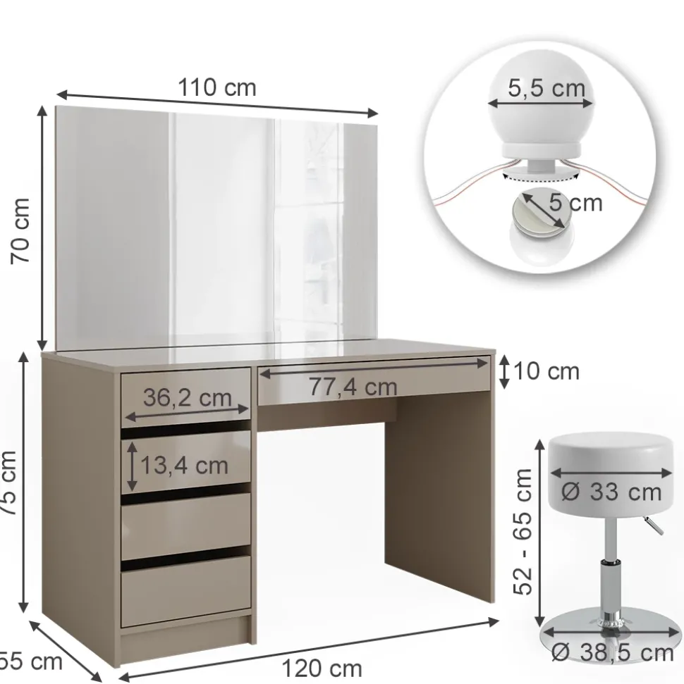- MAßE: Frisiertisch mit LED Beleuchtung und Hocker. Tiefe: 55 cm, Breite: 120 cm, Höhe: 75 cm.