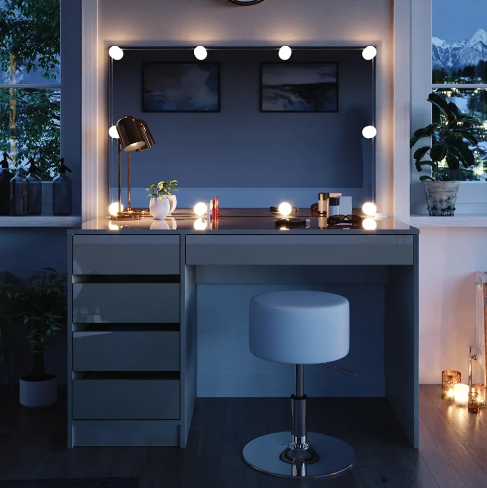 Träumen Sie von Ihrem eigenen kleinen Schönheitsecke, in der Sie sich jeden Morgen in Ruhe für den Tag vorbereiten können? Der Schminktisch „Sherry“ ist die perfekte Ergänzung für Ihr Schlafzimmer oder Ihr Badezimmer. Mit seiner modernen Form und der eleganten Ausstattung, einschließlich einer LED Lichterkette und einer Frisierkommode mit Beleuchtung, wird er zum Mittelpunkt Ihres persönlichen Beauty-Paradieses. Der Schminktisch bietet reichlich Stauraum für all Ihre Schönheitsprodukte und Accessoires und verfügt über einen großen Spiegel, der Ihnen dabei hilft, Ihr bestes Selbst zu präsentieren. Gönnen Sie sich dieses luxuriöse Möbelstück, um sich jeden Tag wie eine Prinzessin zu fühlen.