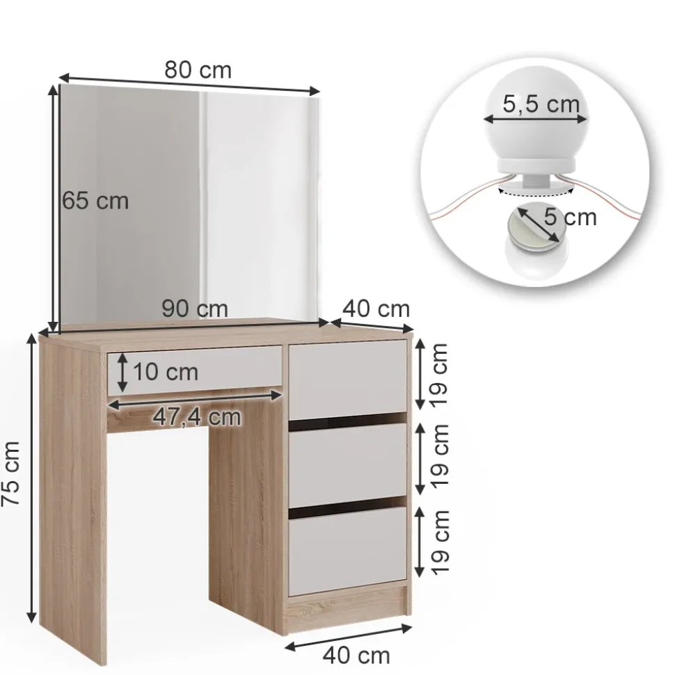 - PRODUKTMAßE: Frisiertisch: 90 x 75 x 40 cm (BxHxT), 28,4 kg. Spiegel: 80 x 65 x 2 cm, 10 kg. LED-Kette: Ø LED-Kugel 5 cm, 400 cm lang, 400 g.
