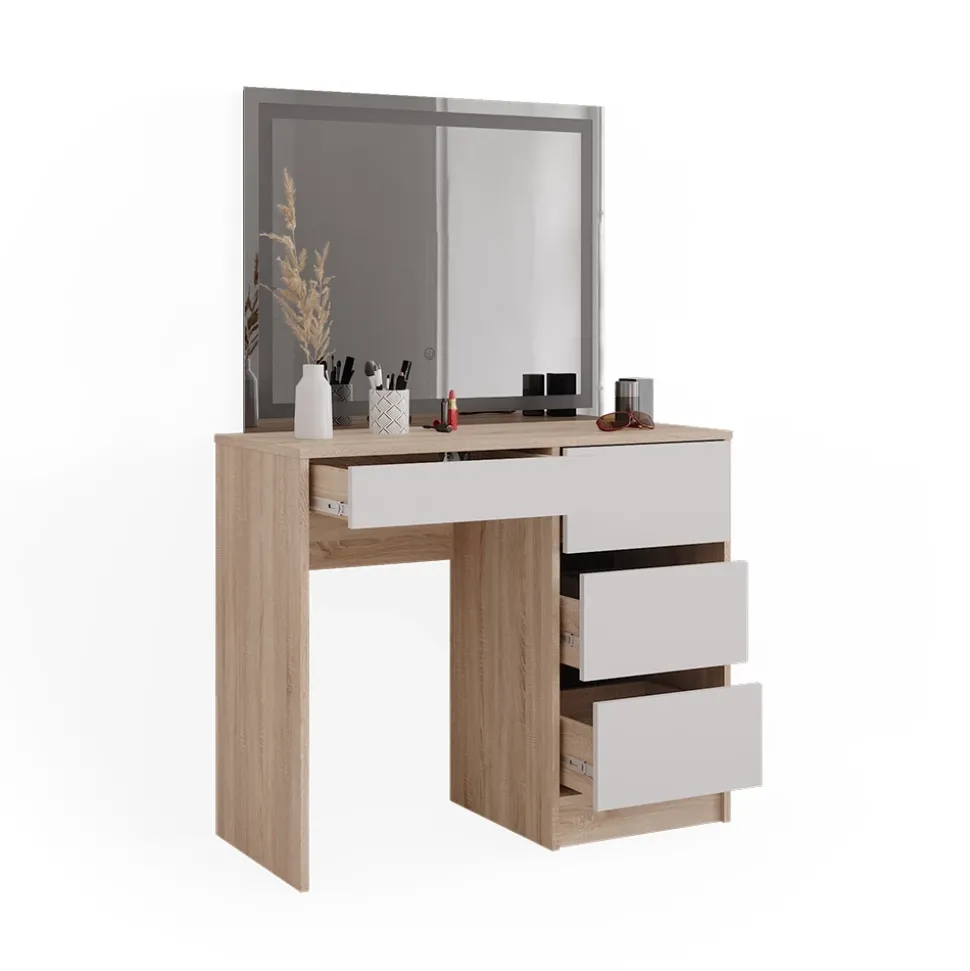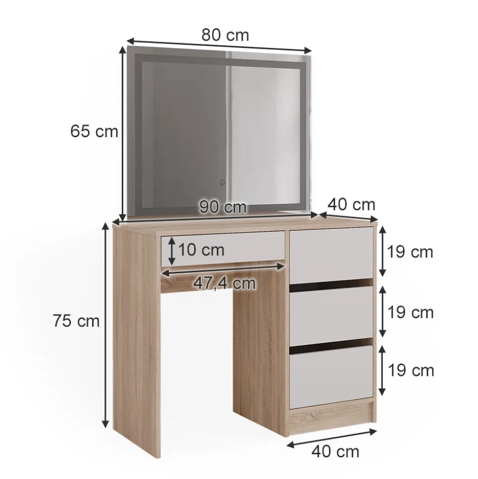 - PRODUKTMAßE: Der Frisiertisch misst 90 x 75 x 40 cm (BxHxT) bei 28,4 kg Gewicht. Der LED-Spiegel ist 80 x 65 x 3 cm und wiegt 5,65 kg.