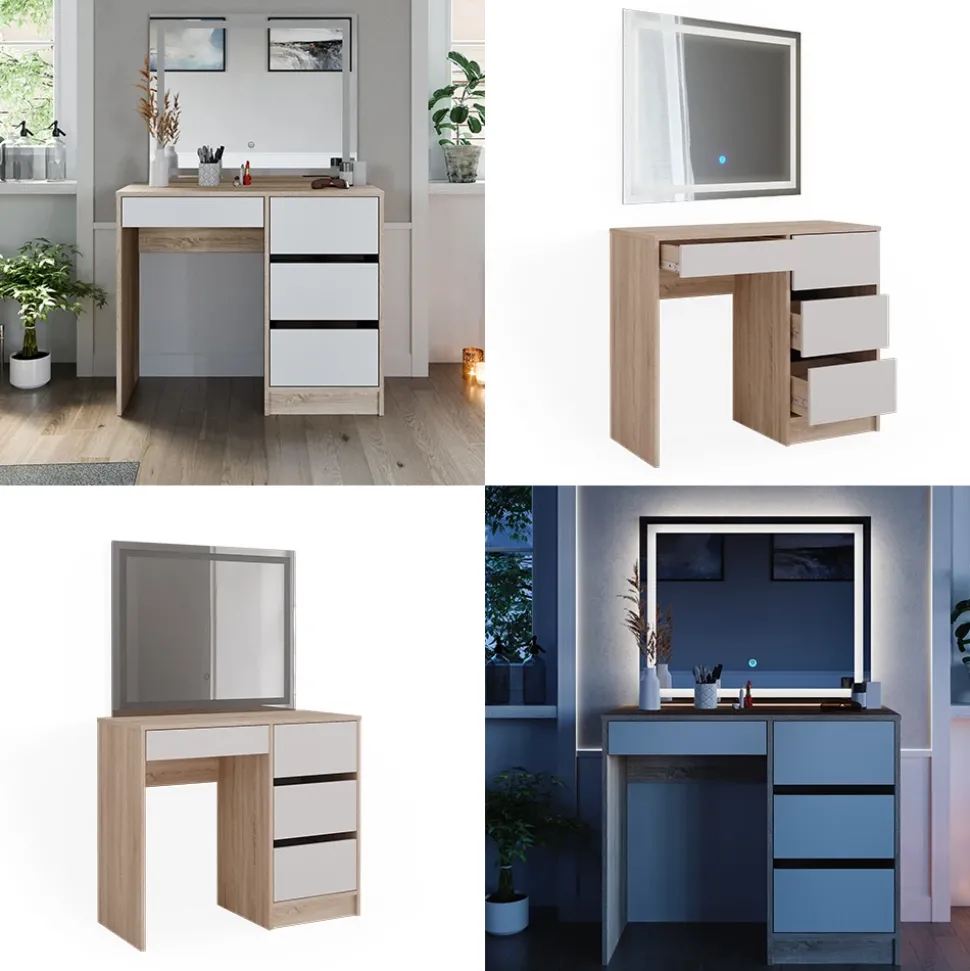 Ein LED-Spiegel ist im Schminktisch-Set enthalten, um Ihnen ein vollständiges Styling-Erlebnis zu bieten. Vielseitige Aufbewahrungsoptionen halten Ihre Kosmetik und Accessoires organisiert. Das moderne Design fügt Eleganz und Stil in Ihr Raumkonzept ein. Dank der einfachen Montage ist Ihr Schminktisch im Handumdrehen einsatzbereit.