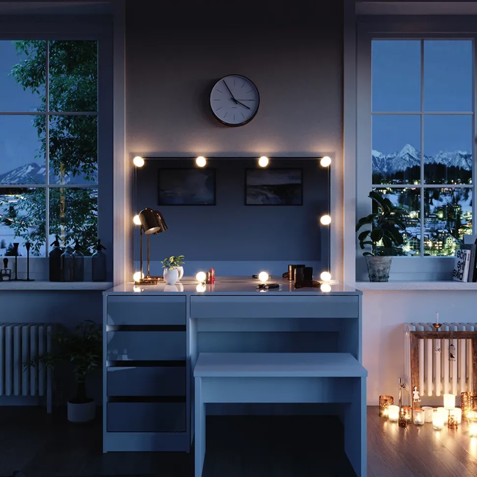 - LIEFERUMFANG: Schminktisch, Sitzbank, LED-Lichterkette, Montageanleitung, Montagematerial.