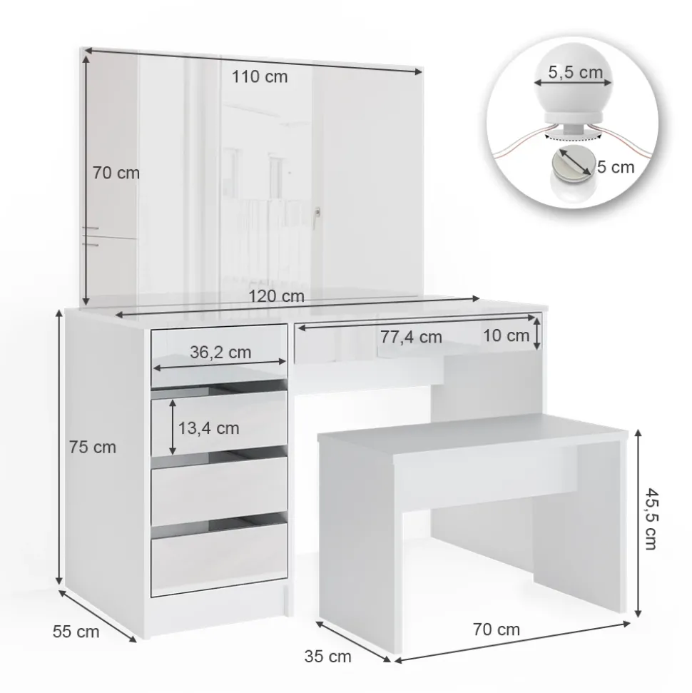- MAßE: Der Frisiertisch hat eine Breite von 120 cm, eine Höhe von 75 cm und eine Tiefe von 55 cm. Alle detaillierten Größen sind auf den Fotos angegeben.
