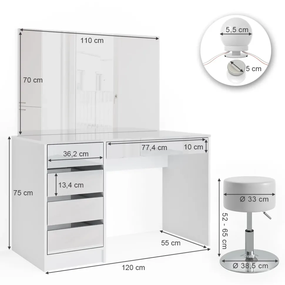 - MAßE: Der Frisiertisch hat eine Breite von 120 cm, eine Höhe von 75 cm und eine Tiefe von 55 cm. Alle detaillierten Größen sind auf den Fotos angegeben.
