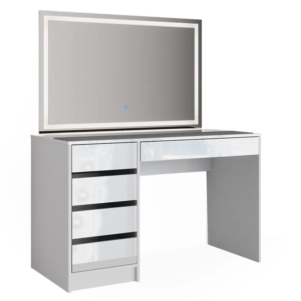 - Funktionaler Kosmetiktisch mit Spiegel und vier geschlossenen Ablagen für eine robuste Aufbewahrung von Kosmetika und Zubehör.
