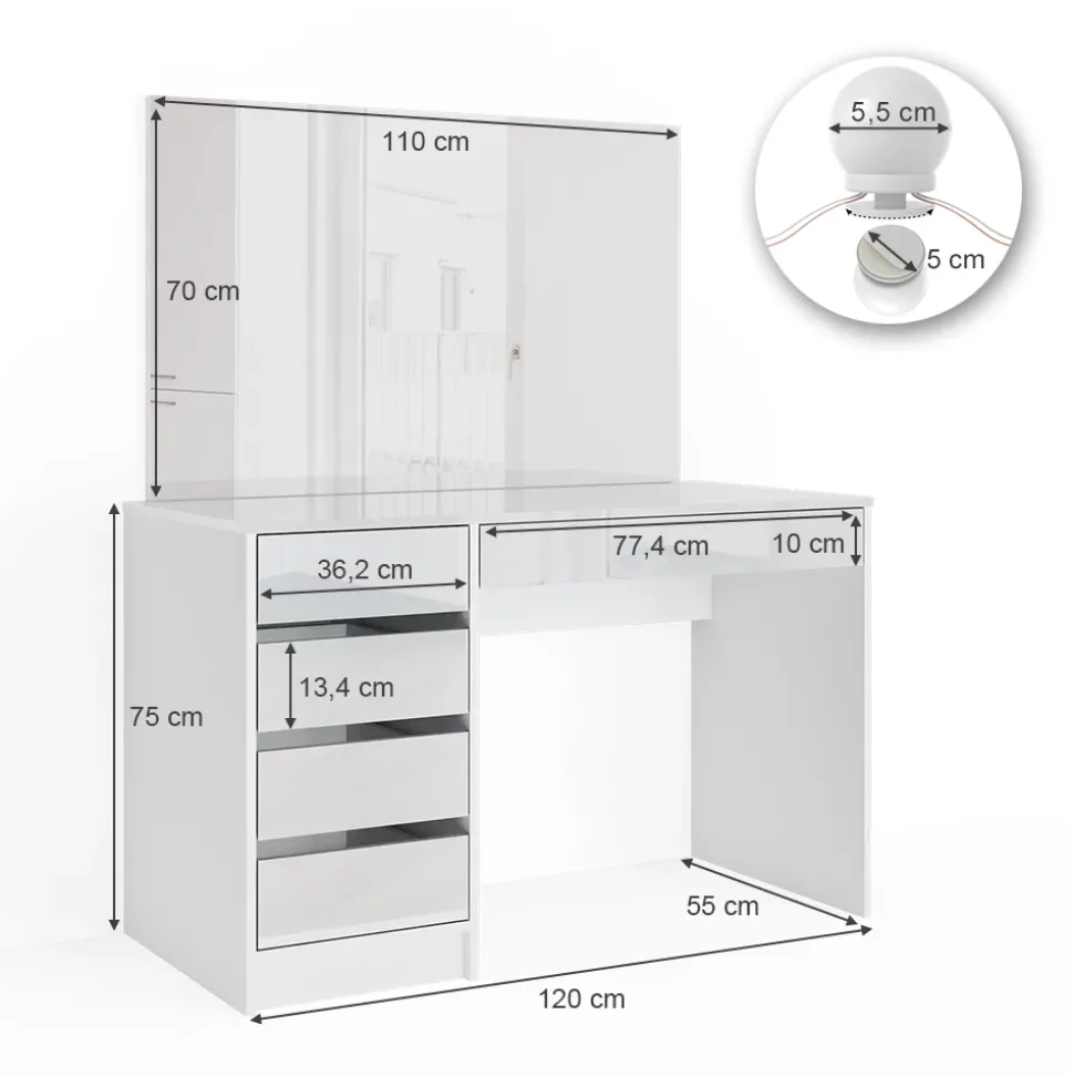 - MAßE: Der Frisiertisch hat eine Breite von 120 cm, eine Höhe von 75 cm und eine Tiefe von 55 cm. Alle detaillierten Größen sind auf den Fotos angegeben.