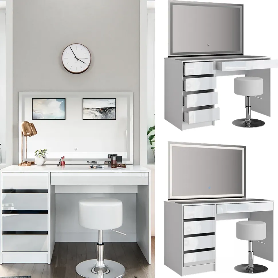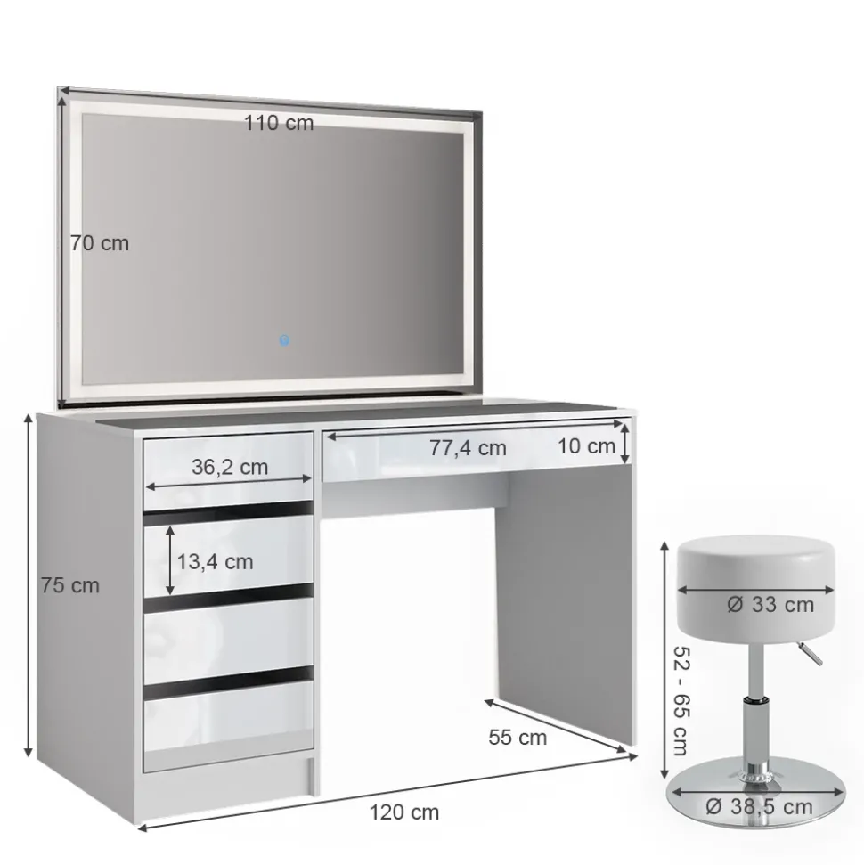 - LIEFERUMFANG: Schminktisch, Hocker für Frisiertisch, LED-Spiegel, Montageanleitung, Montagematerial.
