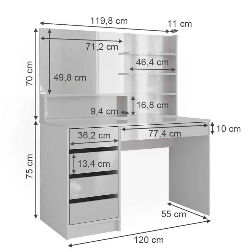 - PRODUKTMAßE: Frisierkommode: 120 x 75 x 55 cm (BxHxT), 40,4 kg. Regal: 119,8 x 70 x 11 cm, Spiegel: 71,2 x 49,8 cm, Gesamt: 16 kg.