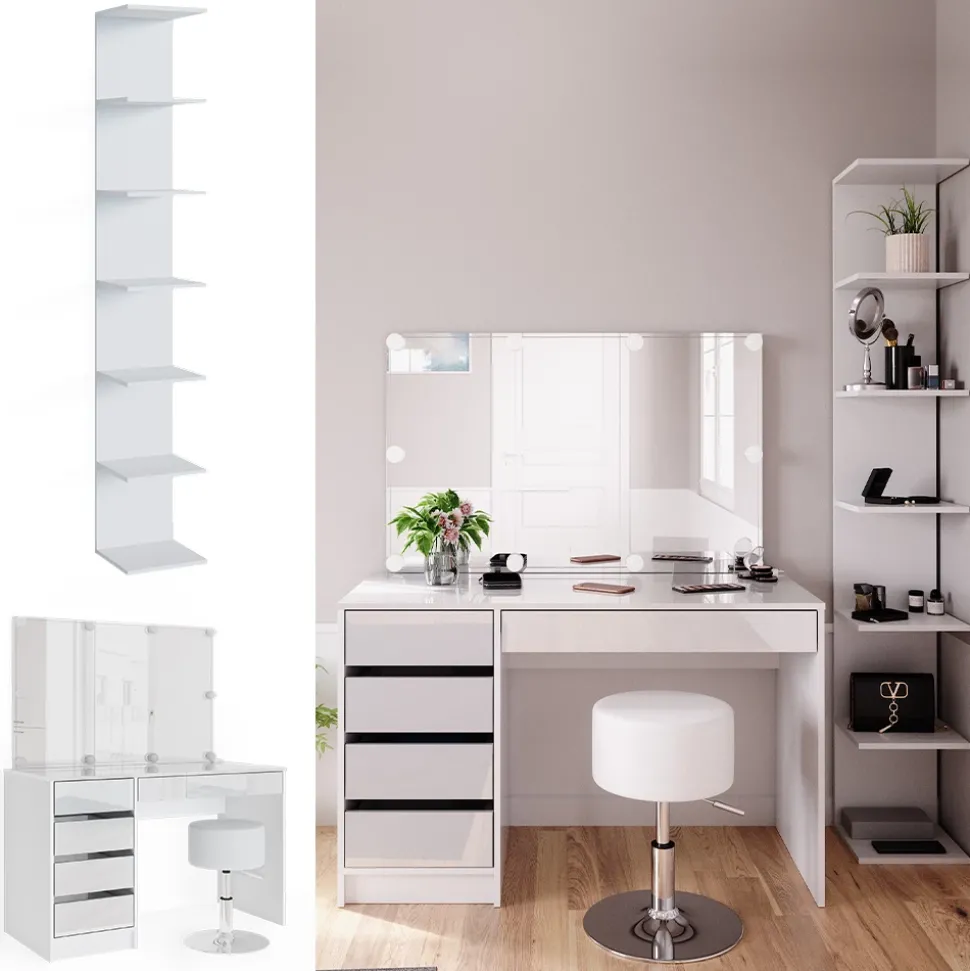 - LIEFERUMFANG: Schminktisch mit Spiegel, Wandregal, Design Hocker, LED-Lichterkette, Montageanleitung, Montagematerial.