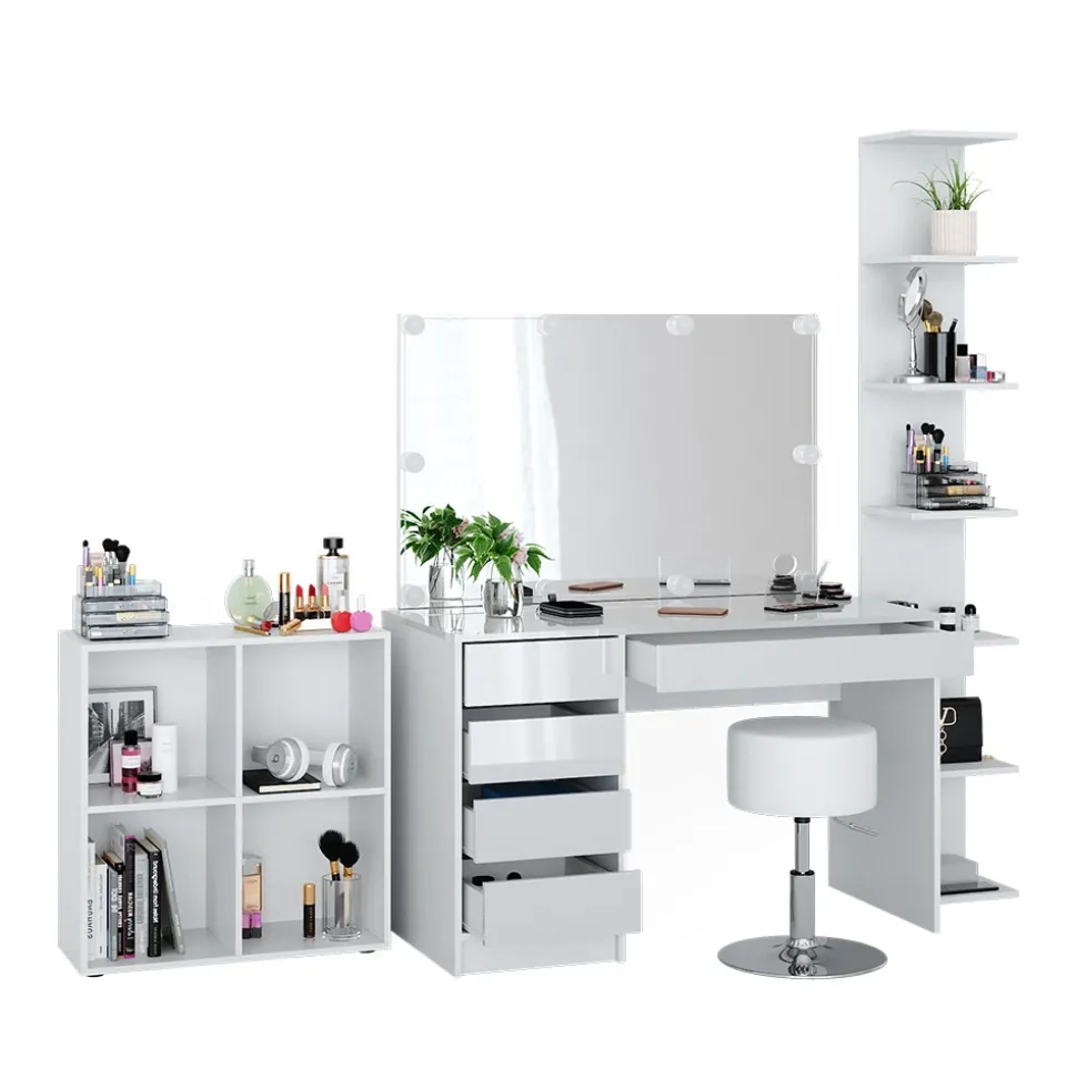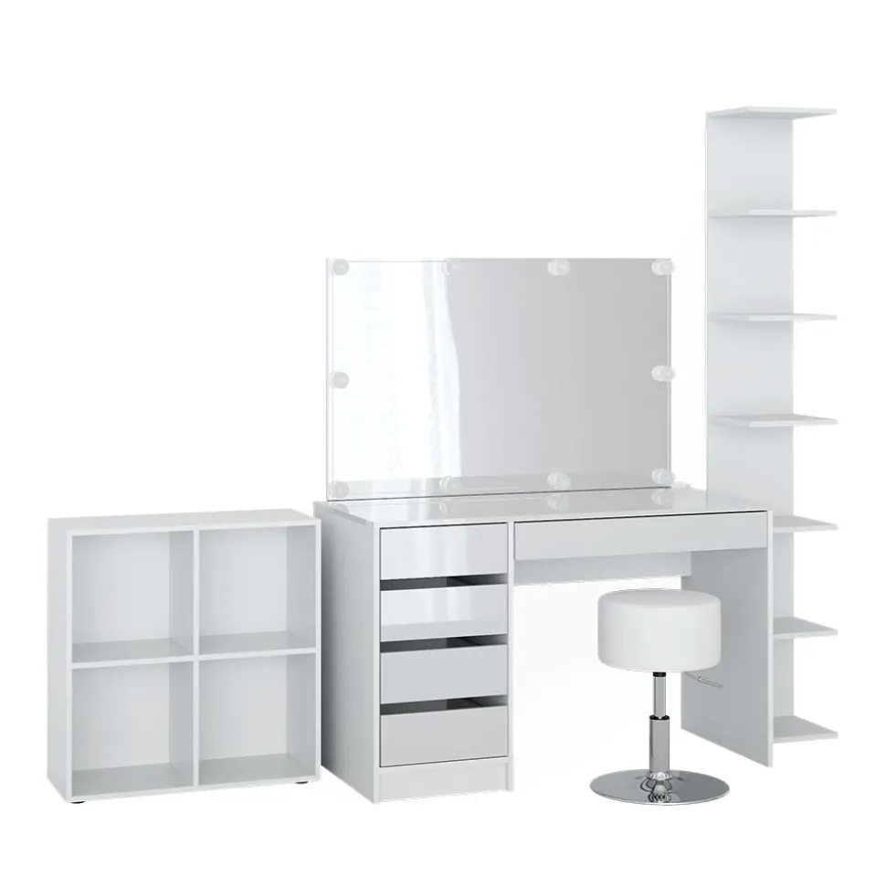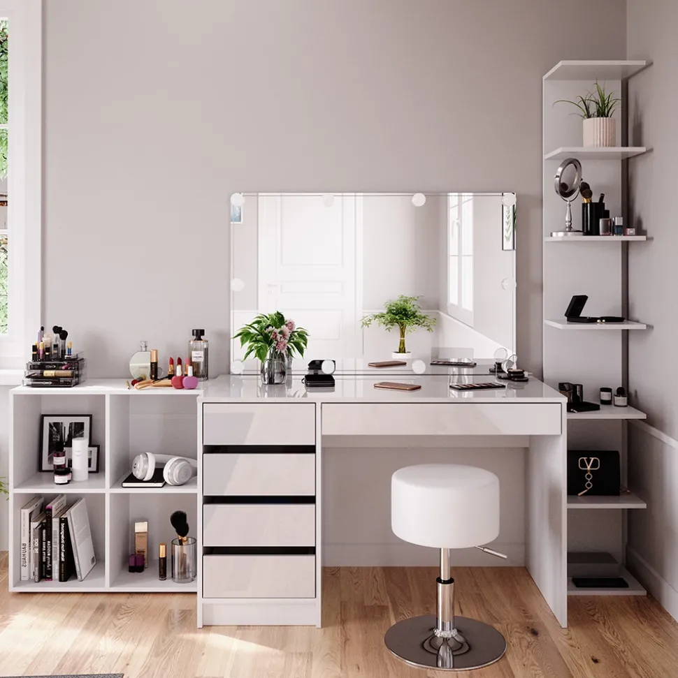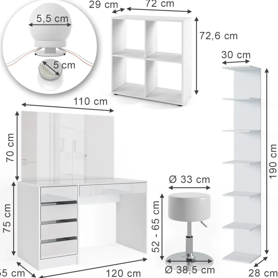 - LIEFERUMFANG: Schminktisch mit Spiegel, Wandregal, Standregal, Design Hocker, LED-Lichterkette, Montageanleitung, Montagematerial.