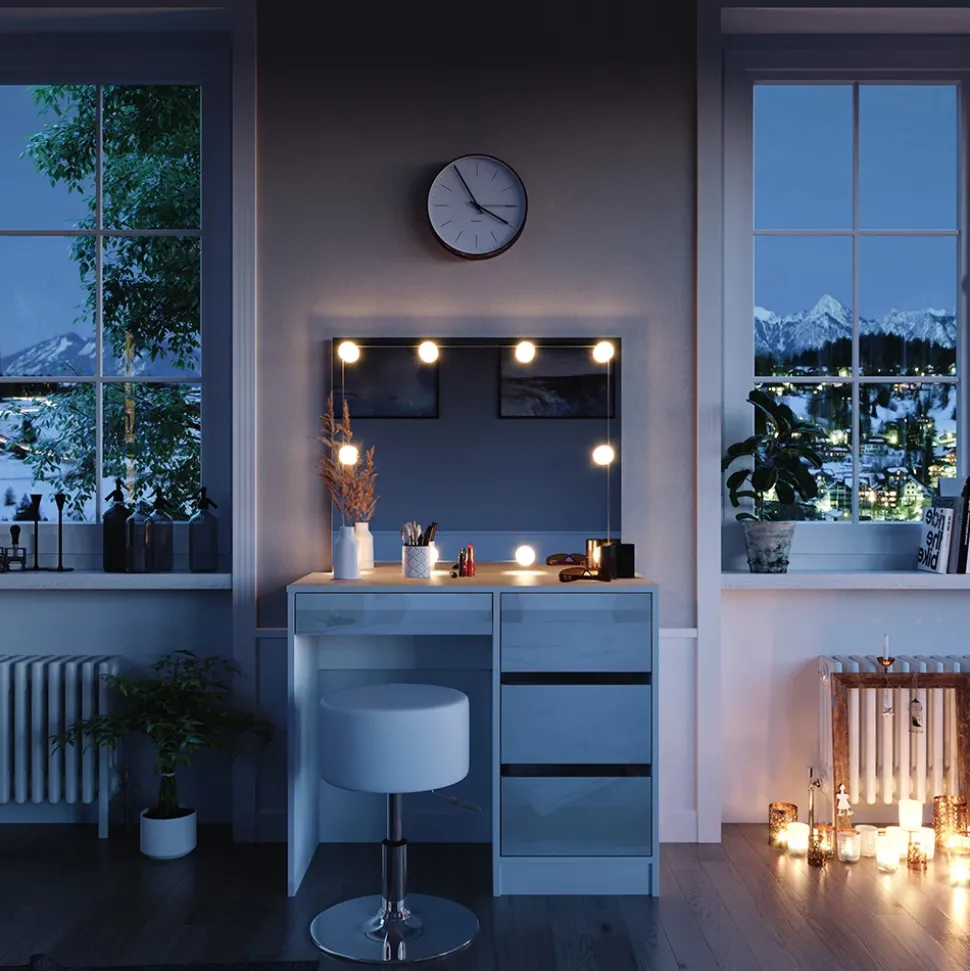 - LIEFERUMFANG: Schminktisch, Hocker, LED-Lichterkette, Montageanleitung, Montagematerial