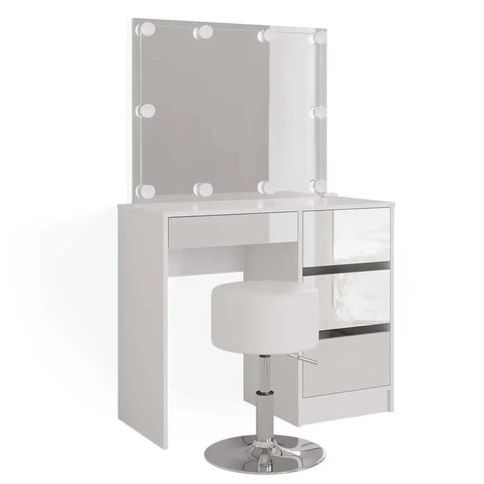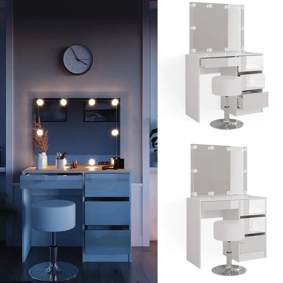 Der Schminktisch Sherry mit LED Beleuchtung und Hocker ist ein wahrer Traum für alle Make-up-Liebhaberinnen! Mit seinem modernen und funktionellen Design ist er nicht nur eine Frisierkommode mit ausreichend Stauraum, sondern auch ein echter Hingucker in jedem Raum. Der große rechteckige Spiegel bietet eine perfekte Sicht auf jedes Make-up-Detail und wird durch die integrierte LED Beleuchtung gekonnt in Szene gesetzt. Die robuste Konstruktion sorgt für eine lange Lebensdauer und die vier geschlossenen Fachböden bieten ausreichend Platz für all Ihre Kosmetik- und Stylingutensilien. Und das Beste? Das Schminktischmodell Sherry ist in verschiedenen Ausführungen erhältlich, damit Sie es perfekt an Ihre Einrichtung anpassen können. Gönnen Sie sich diesen Schminktisch und genießen Sie das luxuriöse Gefühl, sich jeden Tag wie eine Hollywood-Diva zu fühlen!