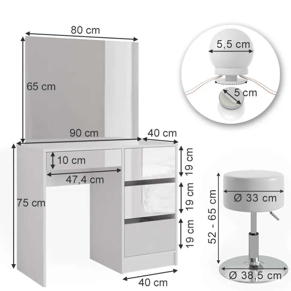 - MAßE: Der Frisiertisch hat eine Breite von 90 cm, eine Höhe von 75 cm und eine Tiefe von 40 cm. Alle detaillierten Größen sind auf den Fotos angegeben.