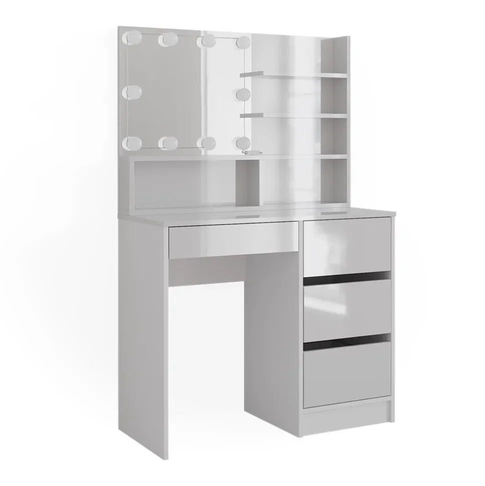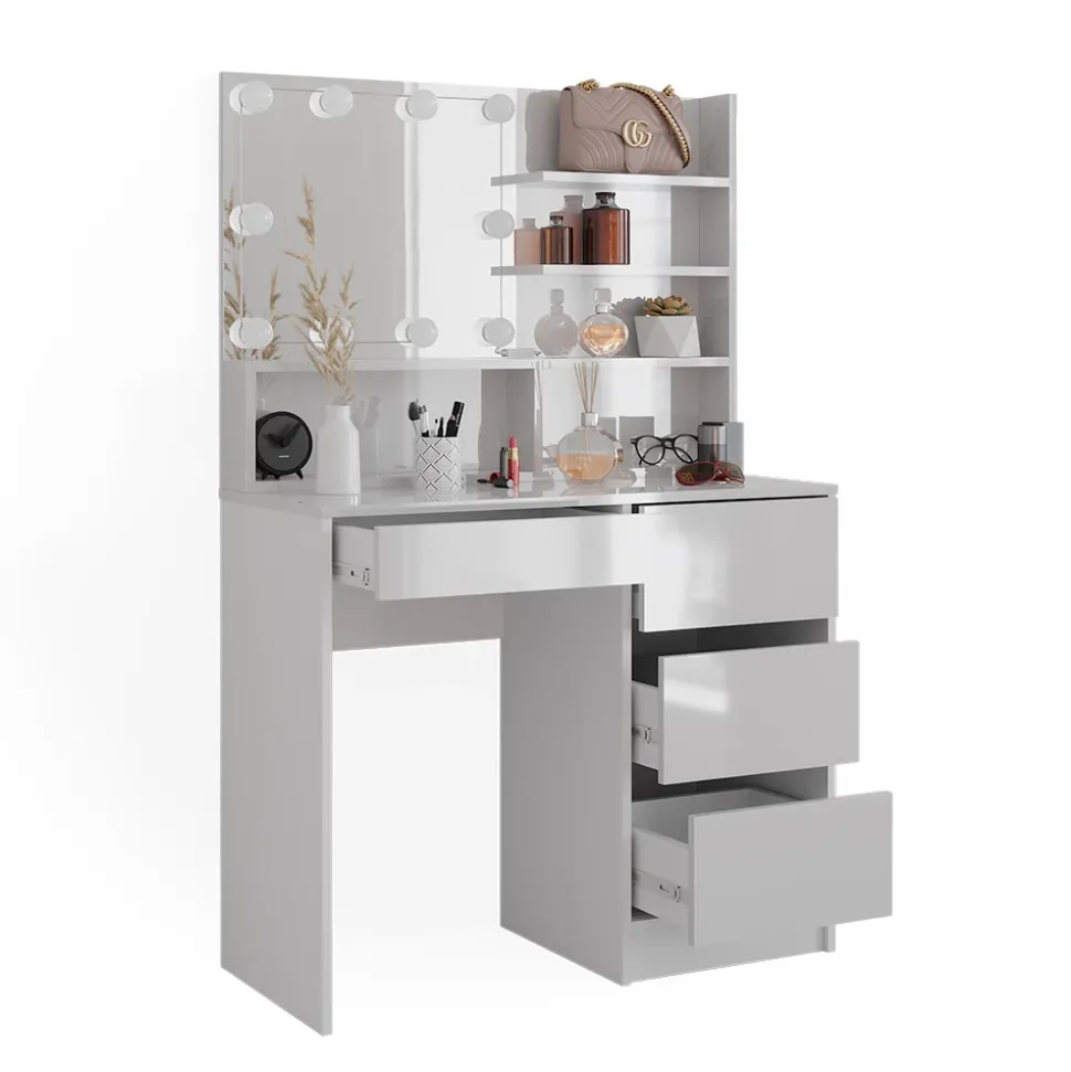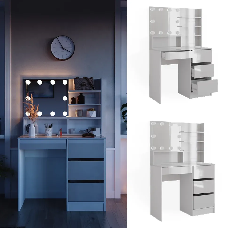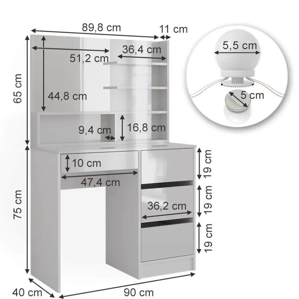 - PRODUKTMAßE: Schminkkommode: 90 x 75 x 40 cm (BxHxT), 38,4 kg. Regal: 89,8 x 65 x 11 cm, Spiegel: 51,2 x 44,8 cm, Gesamt: 11,5 kg. LED-Lichterkette: Ø LED-Kugel 5 cm, 400 cm (L), 400 g.