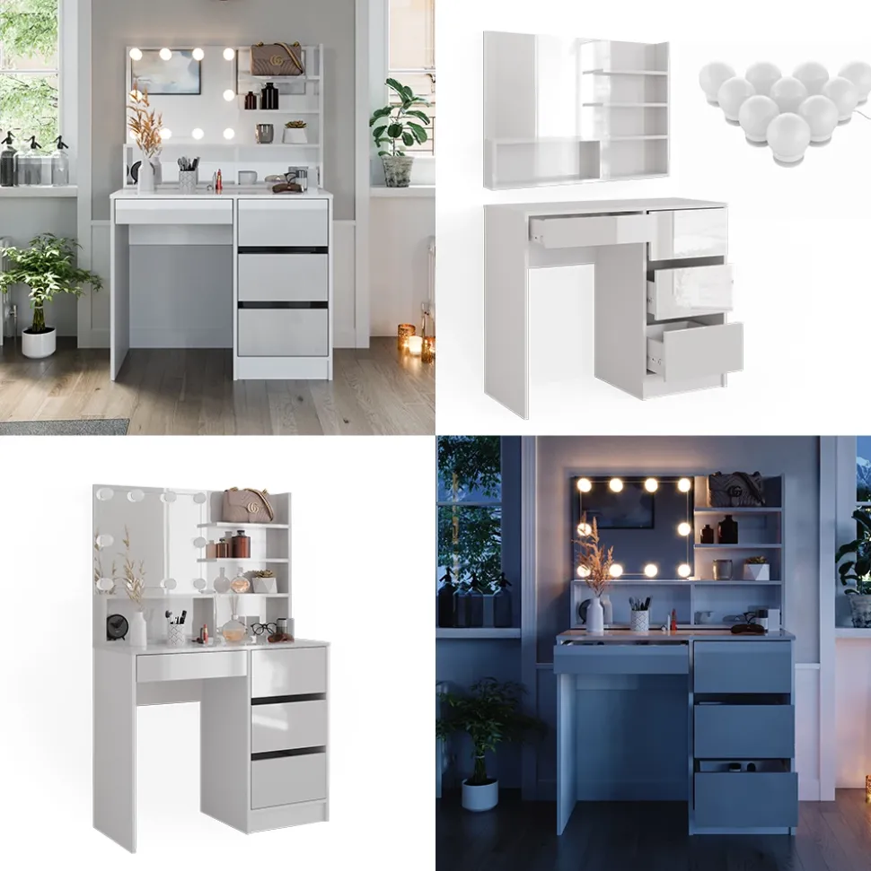 - Das Frisiertisch-Set enthält ein Spiegelregal mit LED-Lichterkette. Die 4 Schubladen der Frisierkommode bieten eine praktische Aufbewahrung für Ihre Kosmetikutensilien.