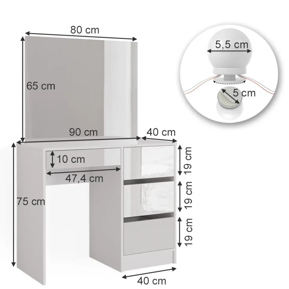 - MAßE: Der Frisiertisch hat eine Breite von 90 cm, eine Höhe von 75 cm und eine Tiefe von 40 cm. Alle detaillierten Größen sind auf den Fotos angegeben.