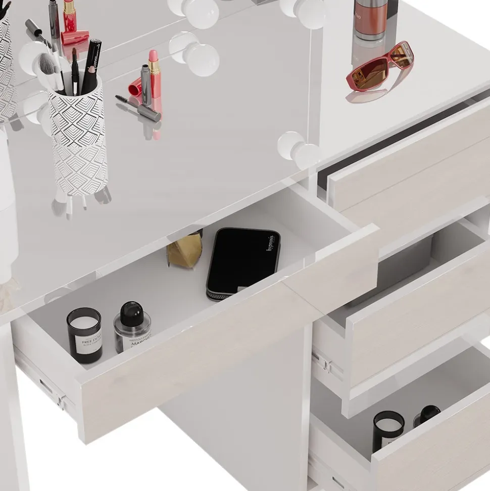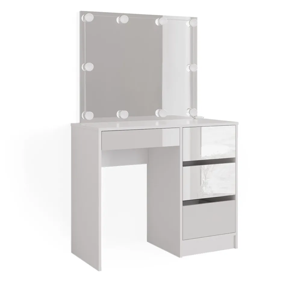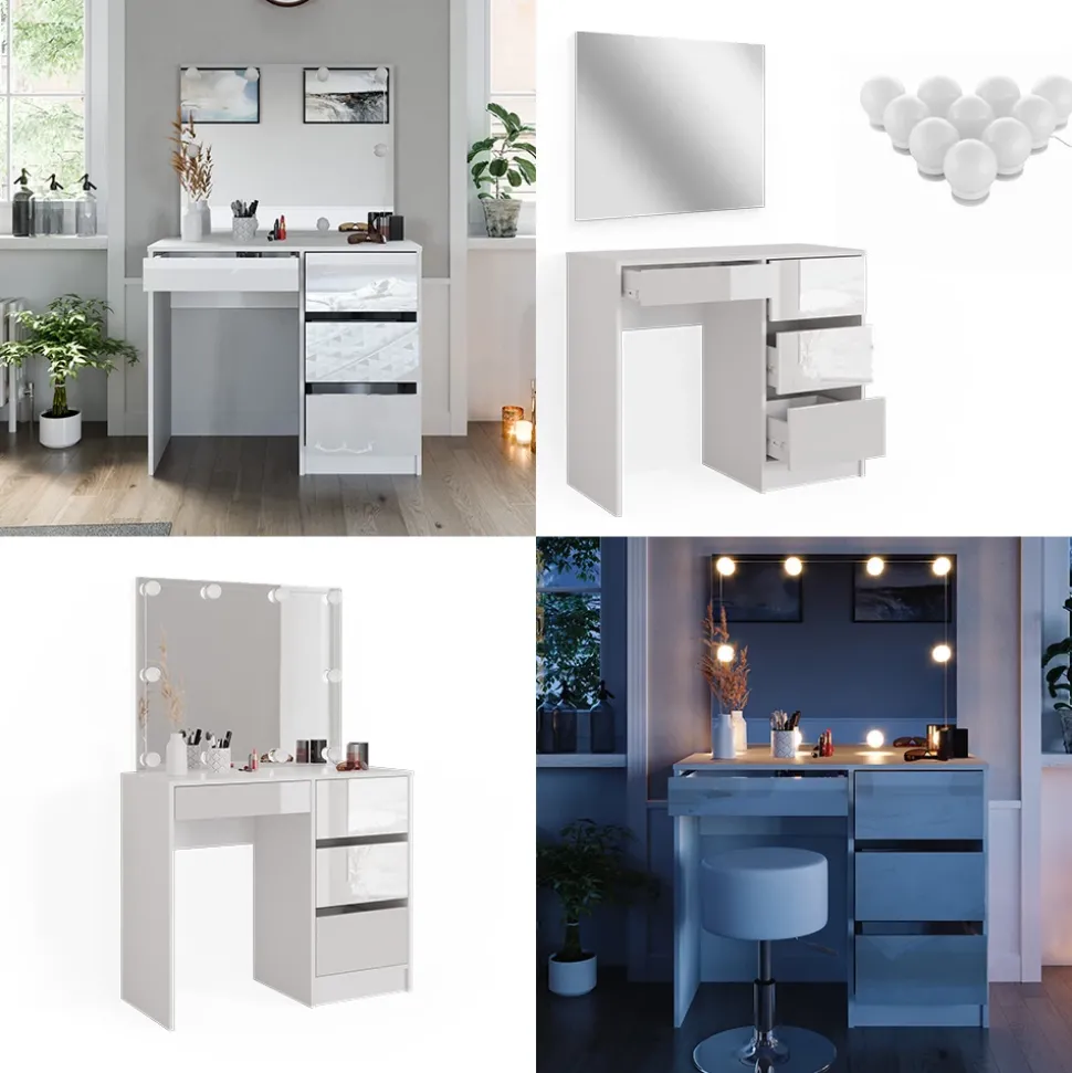 Wollen Sie sich wie eine Prinzessin oder ein Star fühlen? Dann ist der Schminktisch Sherry mit LED Beleuchtung perfekt für Sie. Dieser multifunktionale Frisiertisch bietet nicht nur genug Platz für all Ihre Kosmetika, sondern hat auch einen großen rechteckigen Spiegel, der Ihnen bei Ihrem Schönheitsritual helfen wird. Die robuste Konstruktion und die vier geschlossenen Fachböden sorgen für zusätzlichen Stauraum. Mit seiner Funktionalität und seinem stilvollen Design wird dieser Schminktisch in jeder Umgebung atemberaubend aussehen. Sie können aus verschiedenen Ausführungen wählen und somit Ihren eigenen Stil unterstreichen. Macht das Schminken nicht gleich viel mehr Spaß, wenn man sich wie eine Prinzessin fühlt? Gönnen Sie sich diesen Schminktisch Sherry und verwöhnen Sie sich selbst!