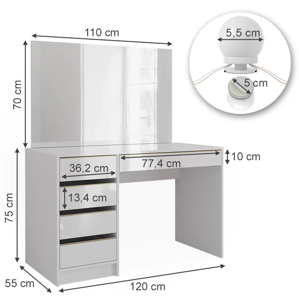 - MAßE:Der Frisiertisch mit LED Beleuchtung hat folgende Maße:Tiefe: 55 cmBreite: 120 cmHöhe: 75 cm