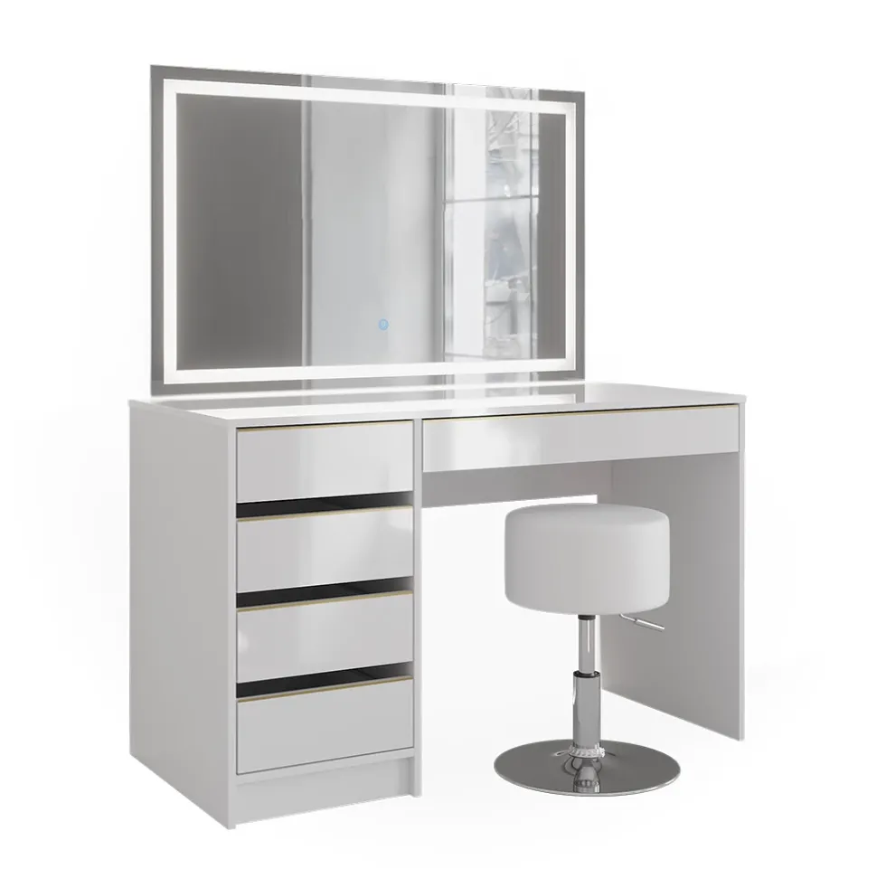 Erleben Sie Luxus und Eleganz mit dem Schminktisch „Sherry“. Dieser frische Frisierraum verbindet modernes Design mit praktischer Funktionalität. Mit einem integrierten Spiegel und einer bezaubernden Beleuchtung bietet dieser Kosmetiktisch die perfekte Umgebung, um sich jeden Tag wunderschön zu fühlen. Der mitgelieferte Hocker sorgt für zusätzlichen Komfort, während die 5 geschlossenen Ablagen ausreichend Platz für all Ihre Schönheitsprodukte bieten. Dieser Schminktisch passt perfekt zu anderen Möbeln und bringt Glamour in Ihr Zuhause. Gönnen Sie sich den Luxus, den Sie verdienen, mit dem Schminktisch „Sherry“.
