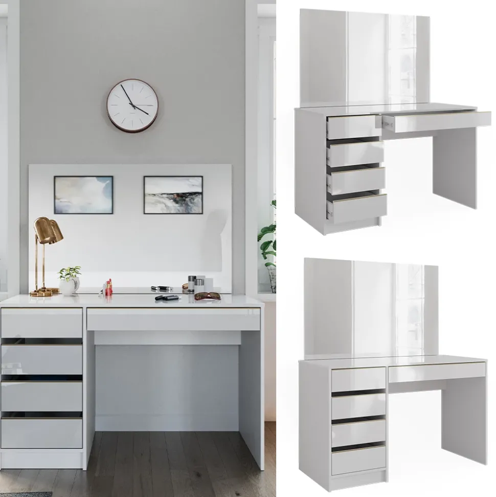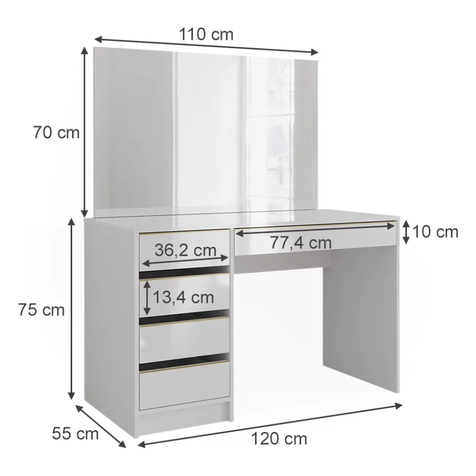 - PRODUKTMAßE: Der Frisiertisch misst 120 x 75 x 55 cm (BxHxT) bei 30,4 kg Gewicht. Der Spiegel hat die Maße 110 x 70 x 2 cm und wiegt 10 kg.