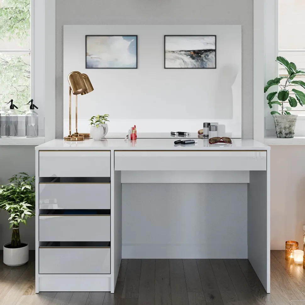 Der Schminktisch Sherry ist der perfekte Begleiter für jeden Beauty-Liebhaber. Mit seinem eleganten Design und dem praktischen Spiegel bietet er nicht nur ausreichend Platz für all Ihre Make-up Utensilien, sondern dient auch als stilvolles Möbelstück in Ihrem Schlafzimmer oder Ankleidezimmer. Lassen Sie sich von Sherry jeden Morgen aufs Neue inspirieren und verwandeln Sie sich in Ihre eigene Schönheitskönigin. Mit diesem Schminktisch wird das tägliche Make-up-Ritual zu einem luxuriösen Erlebnis. Gönnen Sie sich selbst etwas Besonderes mit dem Schminktisch Sherry.