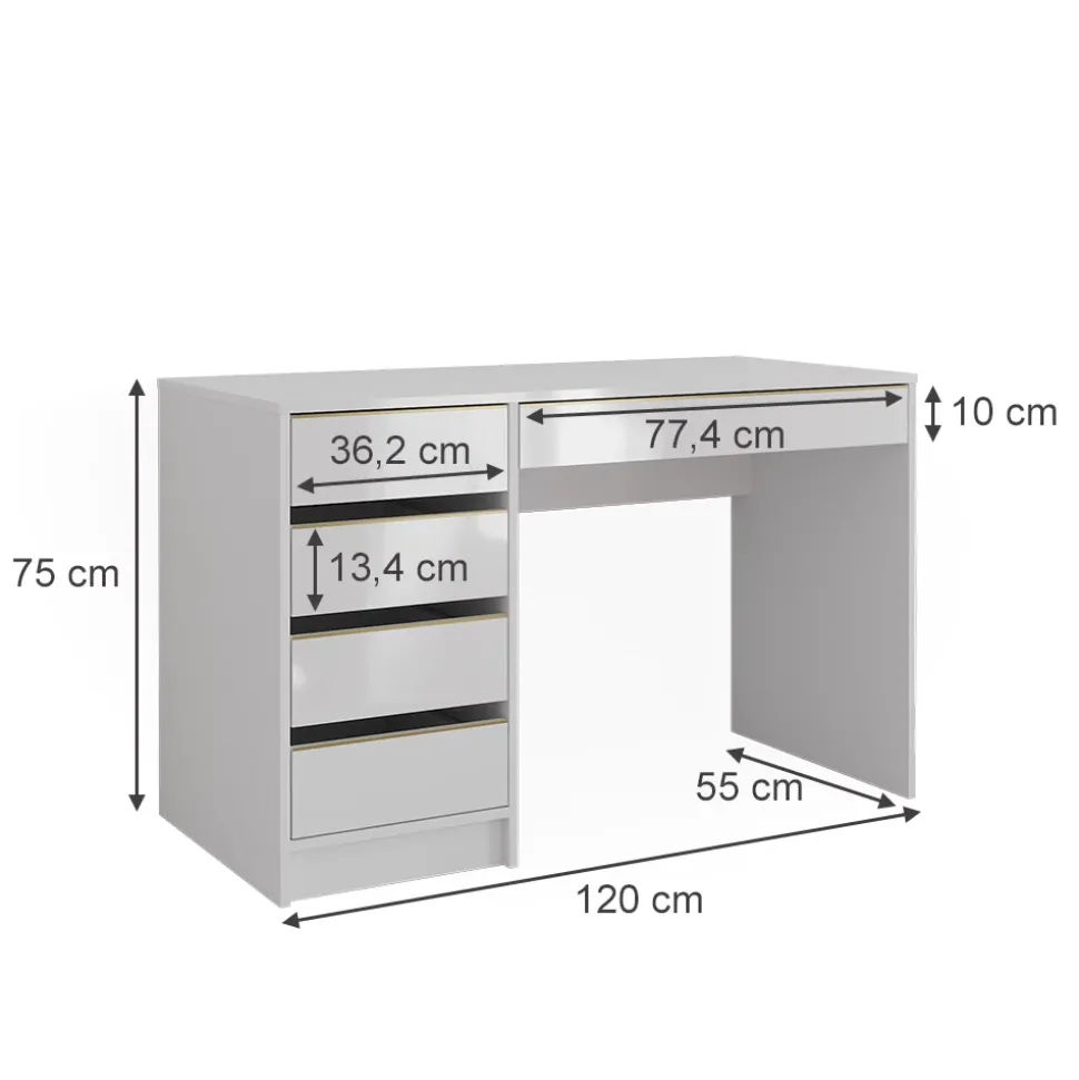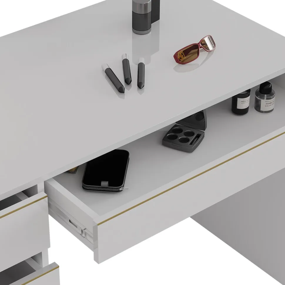 - Entdecken Sie den Schminktisch Sherry: mit seinen Maßen von 120 x 75 cm ist dieser moderne Frisiertisch mit Schubladen die perfekte Ergänzung für Ihr Schlafzimmer.