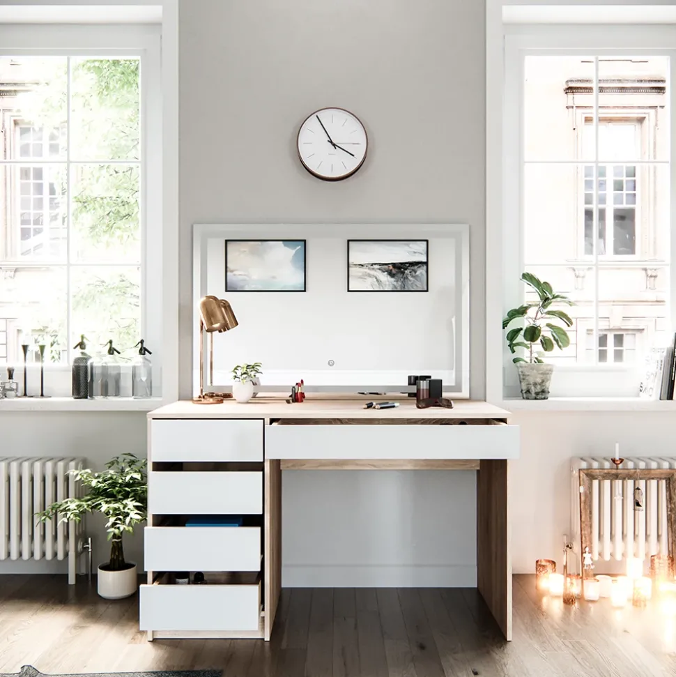 - Funktionaler Kosmetiktisch mit Spiegel und vier geschlossenen Ablagen für eine robuste Aufbewahrung von Kosmetika und Zubehör.
