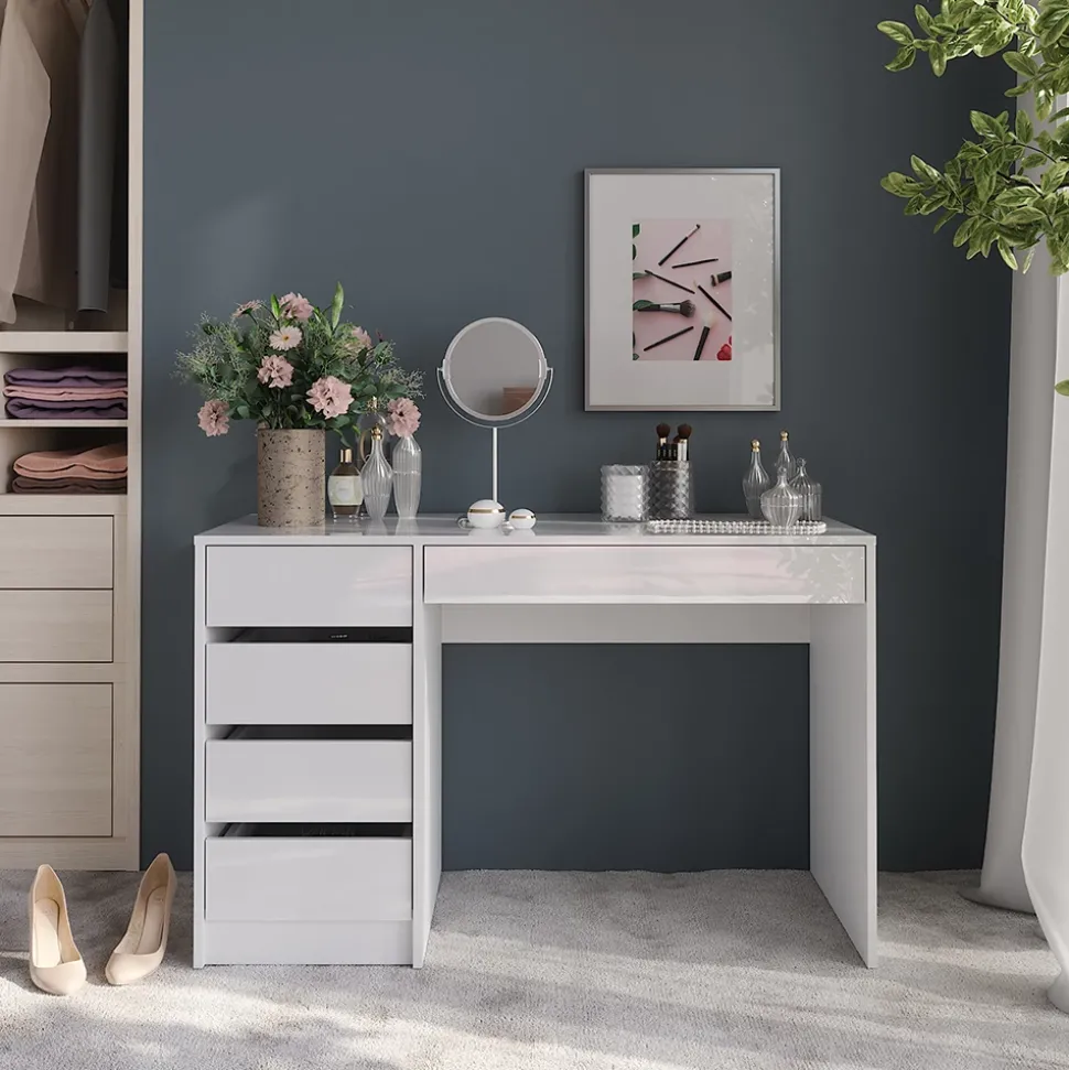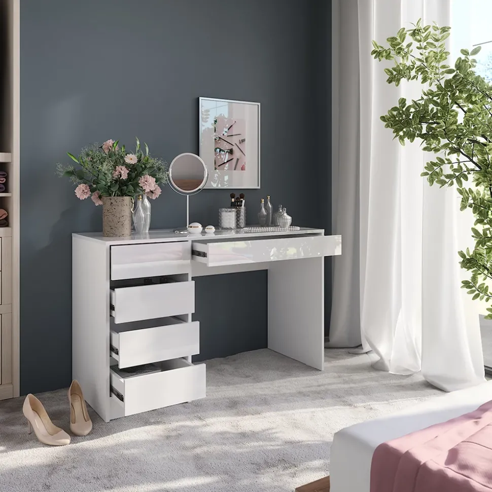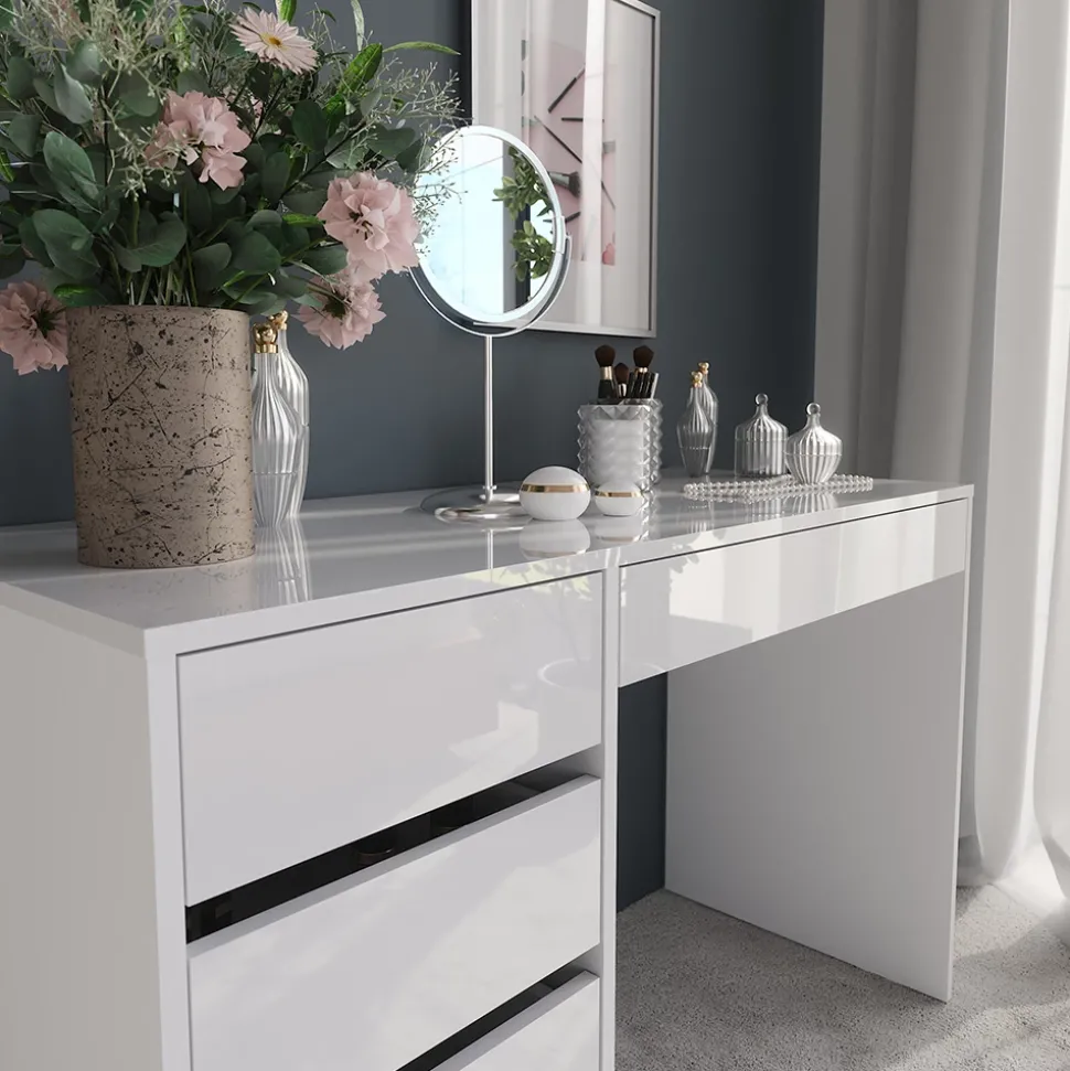 - Der Schminktisch mit Schubladen bietet praktischen Stauraum für deine Kosmetik. Alles ist ordentlich verstaut und jederzeit griffbereit – für mehr Ordnung und Stil.
