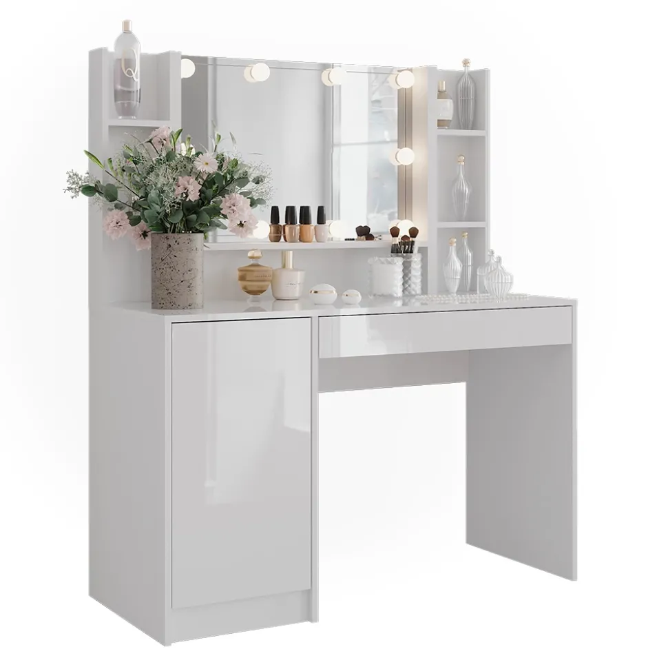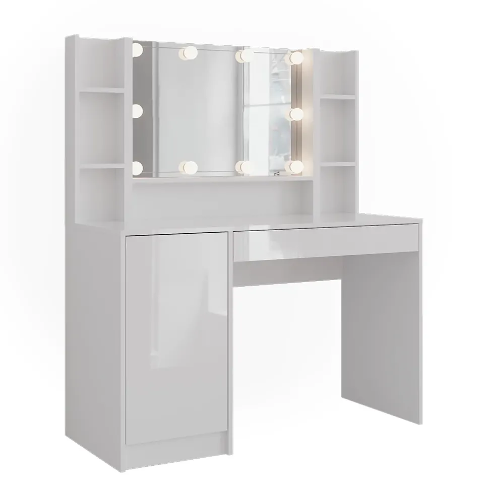 - LIEFERUMFANG: Schminktisch, Container mit Tür, Spiegel, Regal x2, LED-Beleuchtung, Montageanleitung, Montagematerial (Dekoration nicht enthalten)