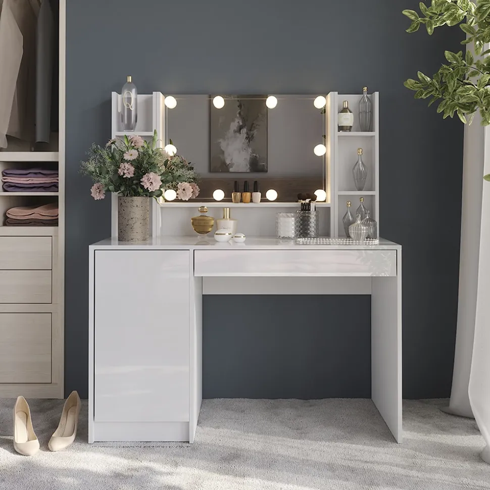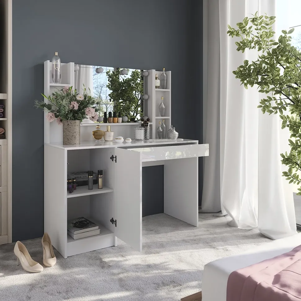 - Der Kosmetiktisch mit Spiegel vereint mehrere funktionale Elemente im modernen Design. Die Tür bietet dir diskreten Stauraum – perfekt, um Produkte ordentlich und staubgeschützt zu verstauen.