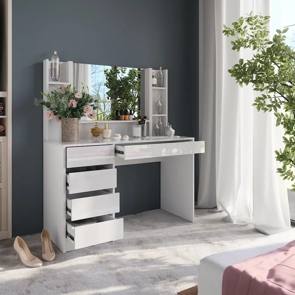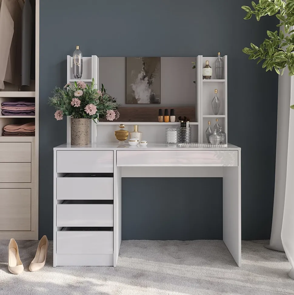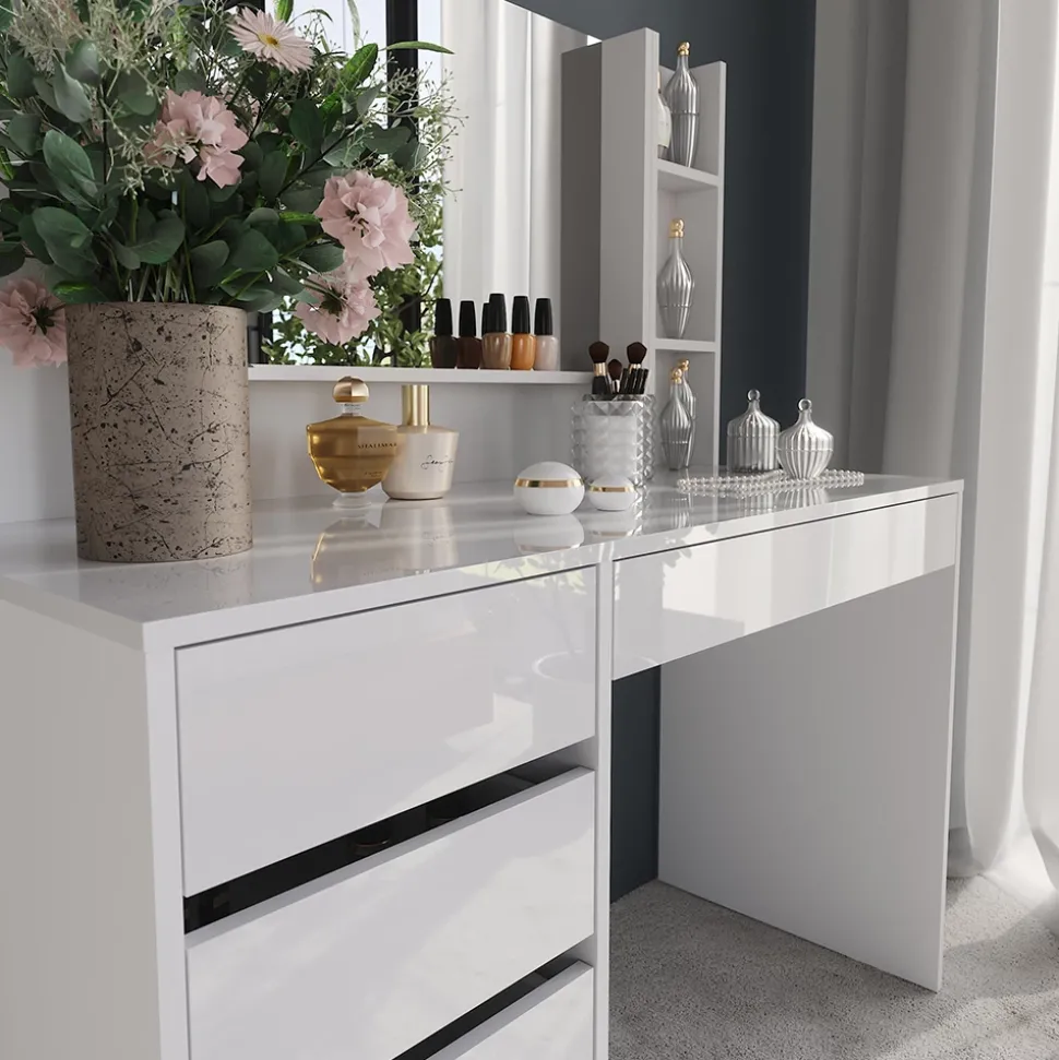 - Der Schminktisch mit Schubladen bietet praktischen Stauraum für deine Kosmetik. Alles ist ordentlich verstaut und jederzeit griffbereit – für mehr Ordnung und Stil.