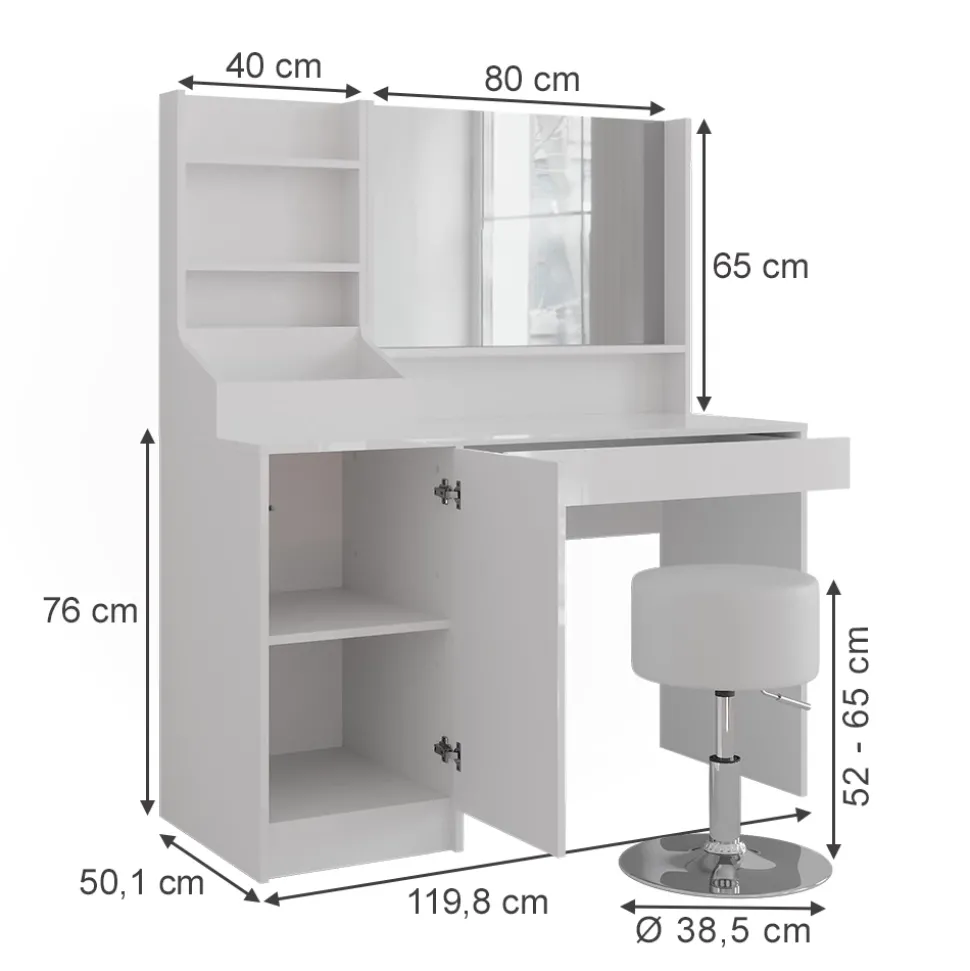 - LIEFERUMFANG: Schminktisch, Container mit Tür, Spiegel, Regal, Hocker mit Griff, Montageanleitung, Montagematerial (Dekoration nicht enthalten)
