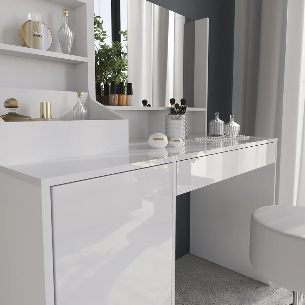 - Der Kosmetiktisch mit Spiegel vereint mehrere funktionale Elemente im modernen Design. Die Tür bietet dir diskreten Stauraum – perfekt, um Produkte ordentlich und staubgeschützt zu verstauen.