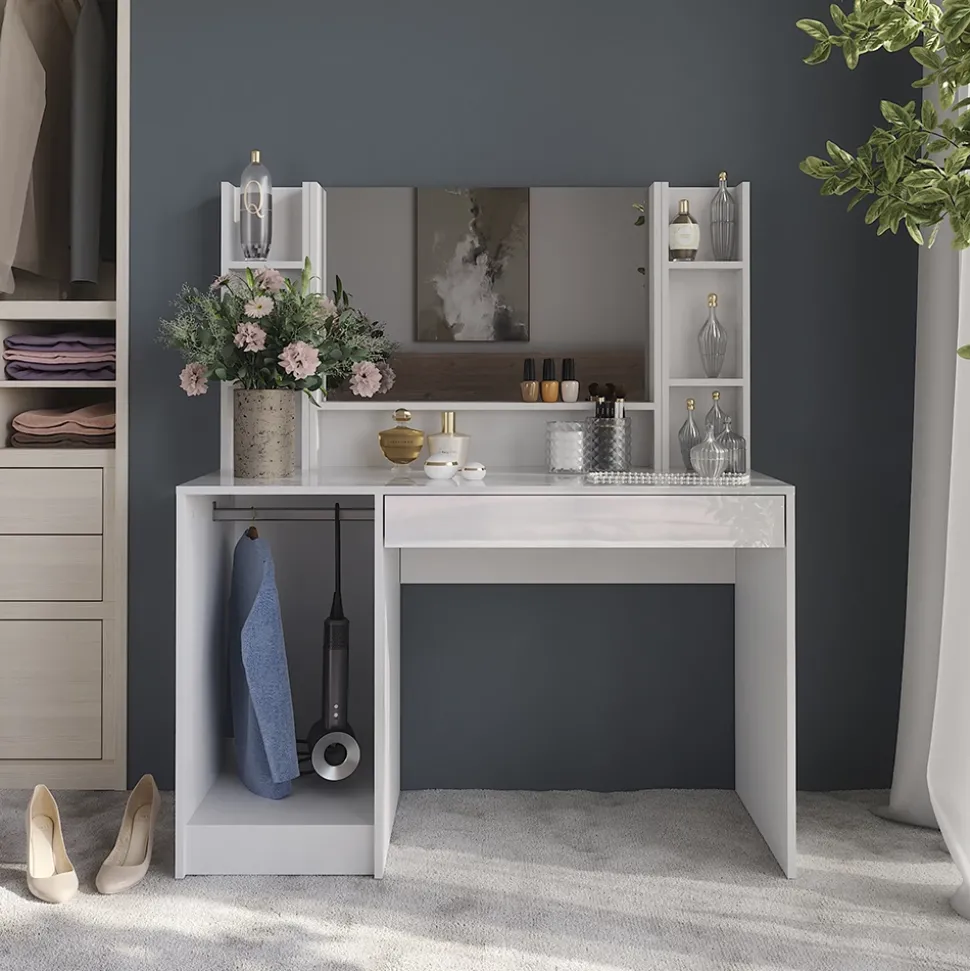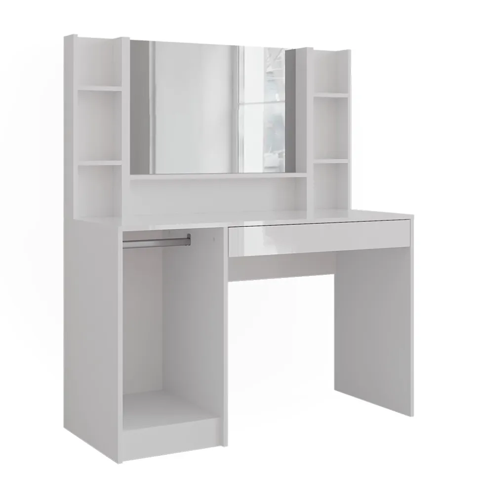 - LIEFERUMFANG: Schminktisch, Container mit Kleiderstang , Spiegel, Regal 2 Stck, Montageanleitung, Montagematerial (Dekoration nicht enthalten)