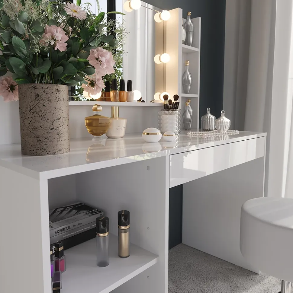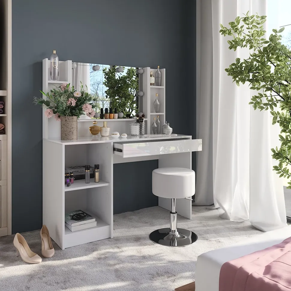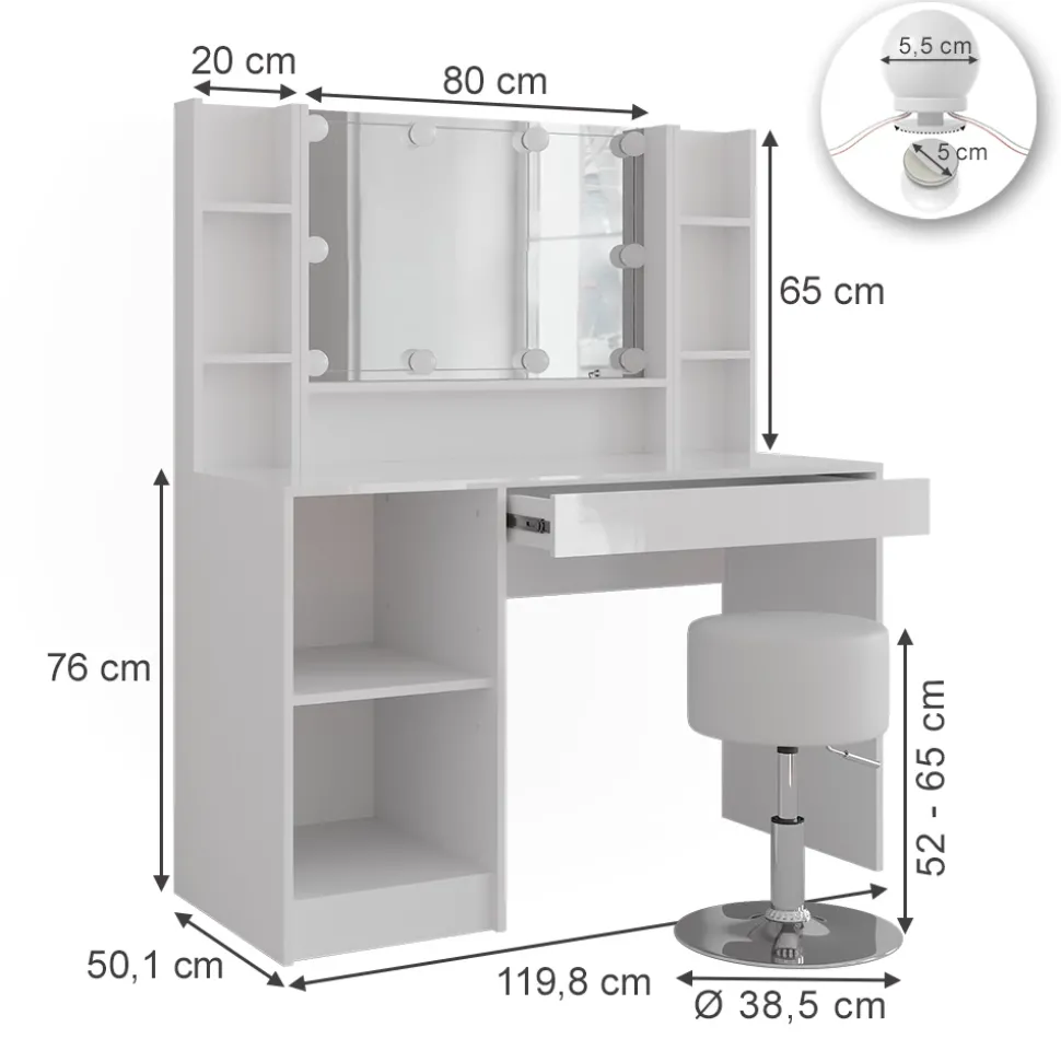 - LIEFERUMFANG: Schminktisch, Container offen Einlegeboden, Spiegel, Regal x2, Set Lampen & Hocker, Montageanleitung, Montagematerial (Dekoration nicht enthalten)