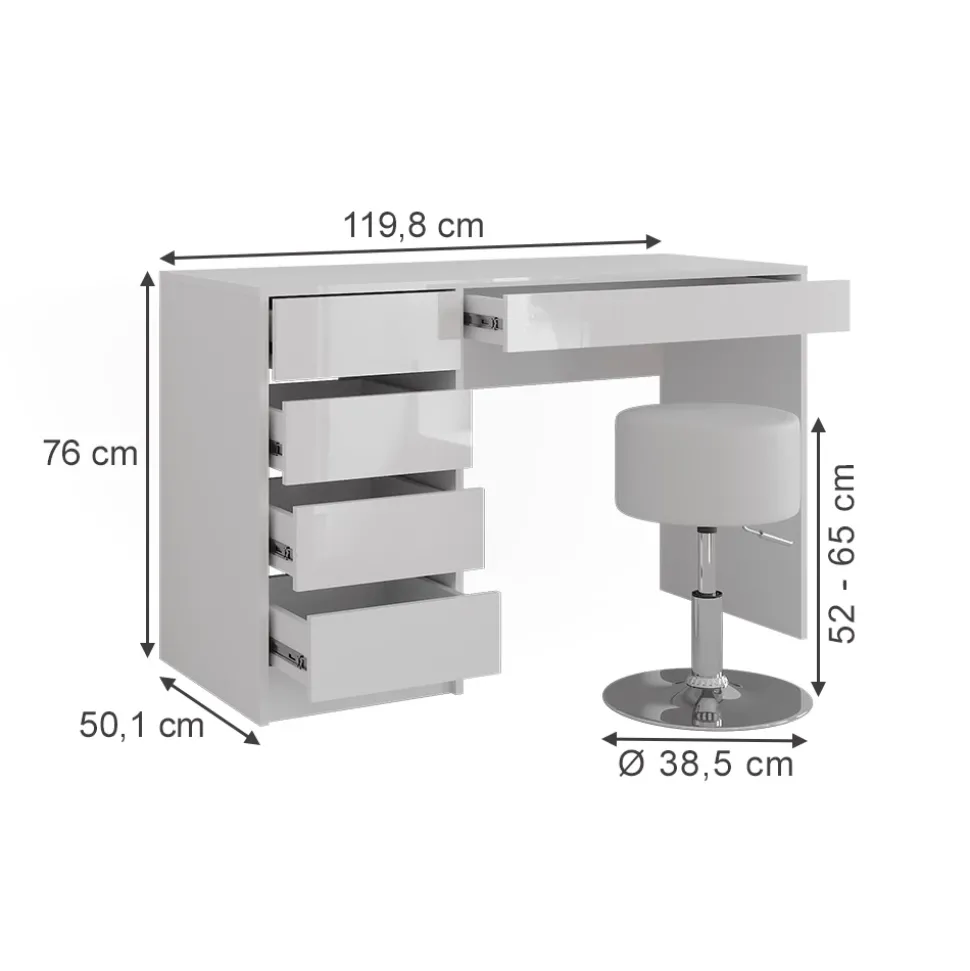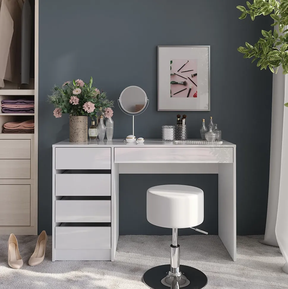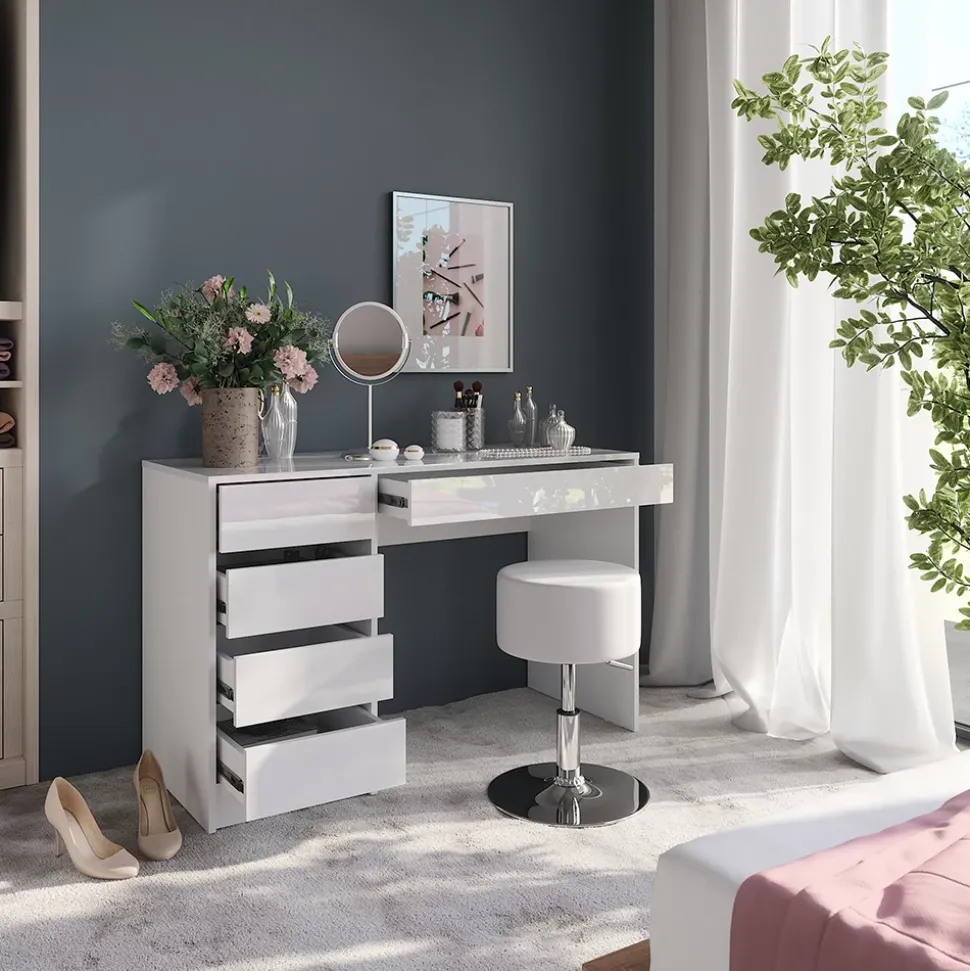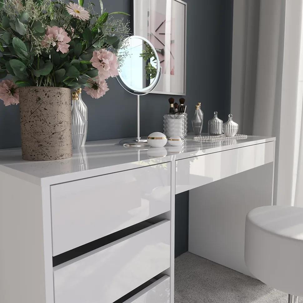 - Der Schminktisch mit Schubladen bietet praktischen Stauraum für deine Kosmetik. Alles ist ordentlich verstaut und jederzeit griffbereit – für mehr Ordnung und Stil.