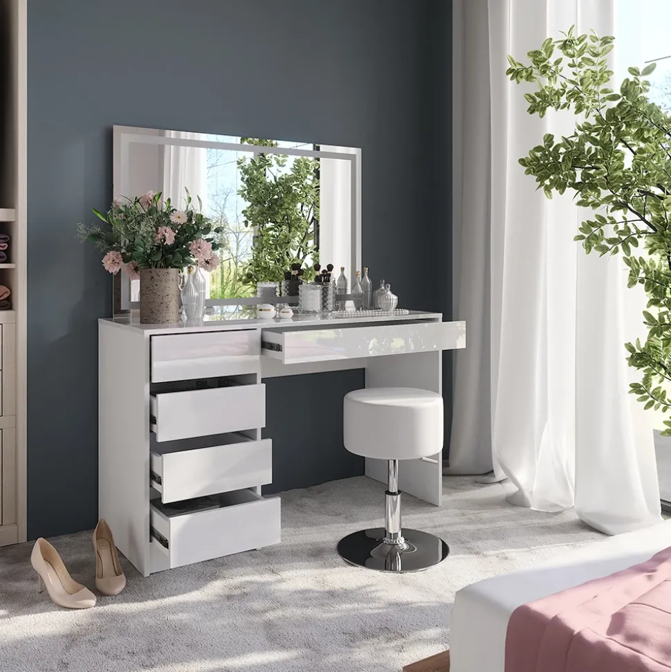 - Der Schminktisch mit Schubladen bietet praktischen Stauraum für deine Kosmetik. Alles ist ordentlich verstaut und jederzeit griffbereit – für mehr Ordnung und Stil.
