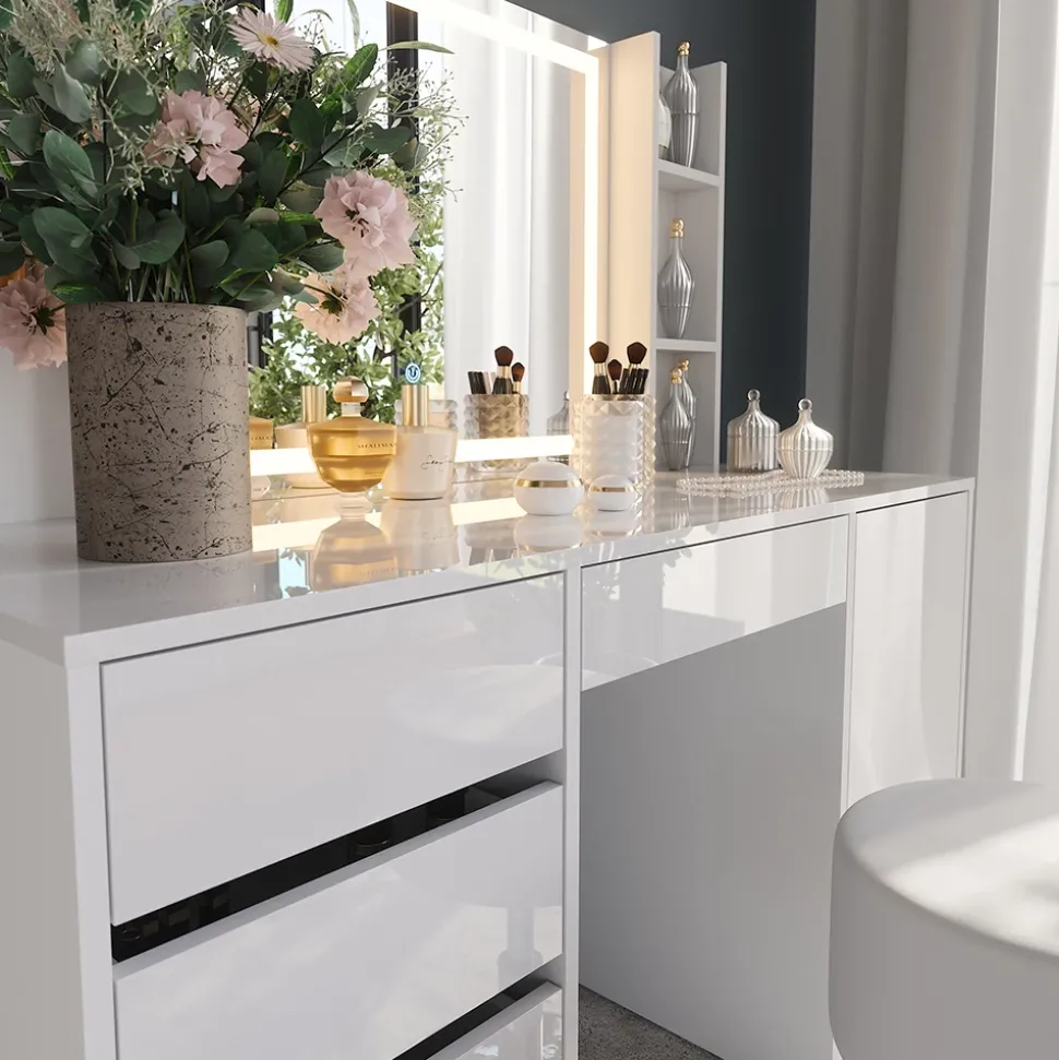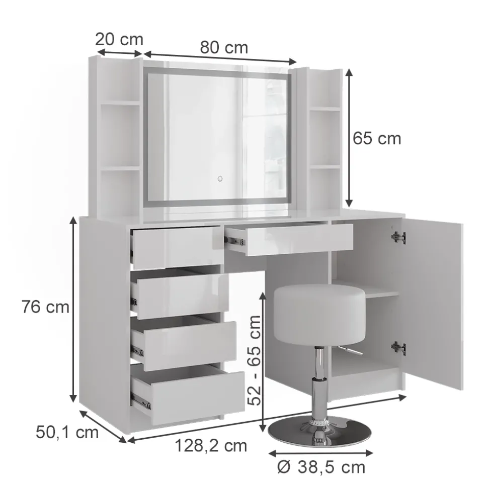 - LIEFERUMFANG: Schminktisch, Container mit Schubladen, Container mit Tür, Spiegel LED, Regal x2, Hocker mit Griff, Montageanleitung, Montagematerial (Dekoration nicht enthalten)