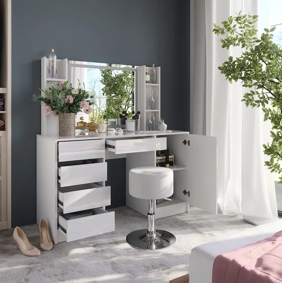 Der Schminktisch „Sherry“ vereint elegantes Design mit cleverer Funktionalität und wird im Handumdrehen zu deinem Lieblingsplatz. Ob modern, klassisch oder dezent – dank vielfältiger Kombinationsmöglichkeiten findest du genau die Variante, die wie für dich und dein Zuhause gemacht ist. „Sherry“ ist mehr als ein Möbelstück – er schenkt dir jeden Tag einen kleinen Wohlfühlmoment. Entdecke die Vielfalt und finde deinen persönlichen Traum-Frisiertisch, der Schönheit und Ordnung mit einem Hauch Luxus vereint.