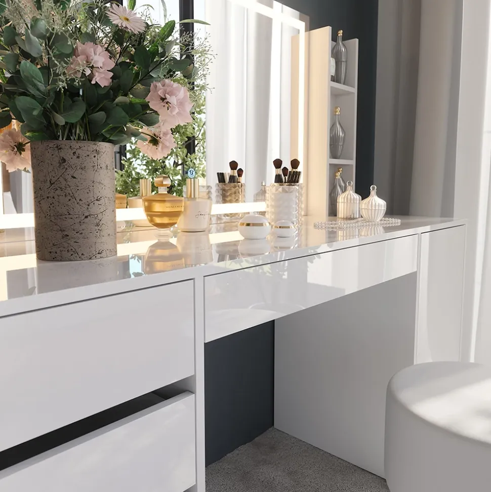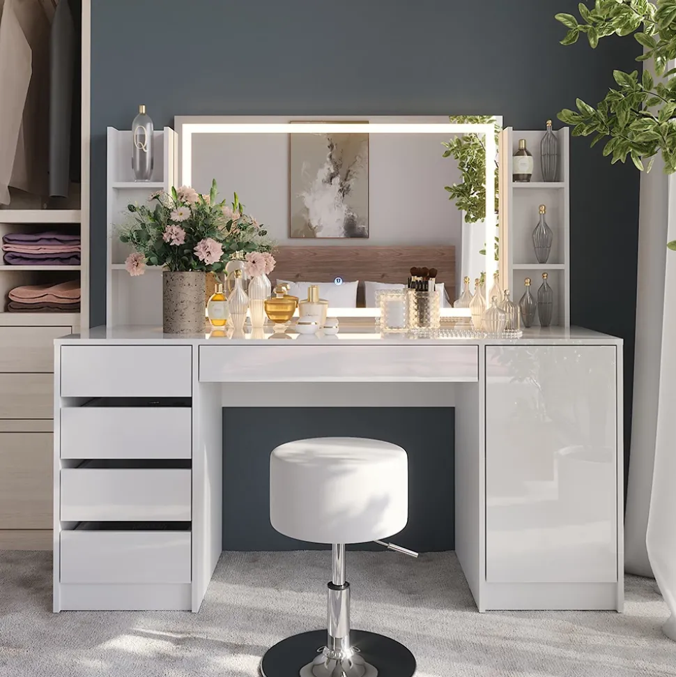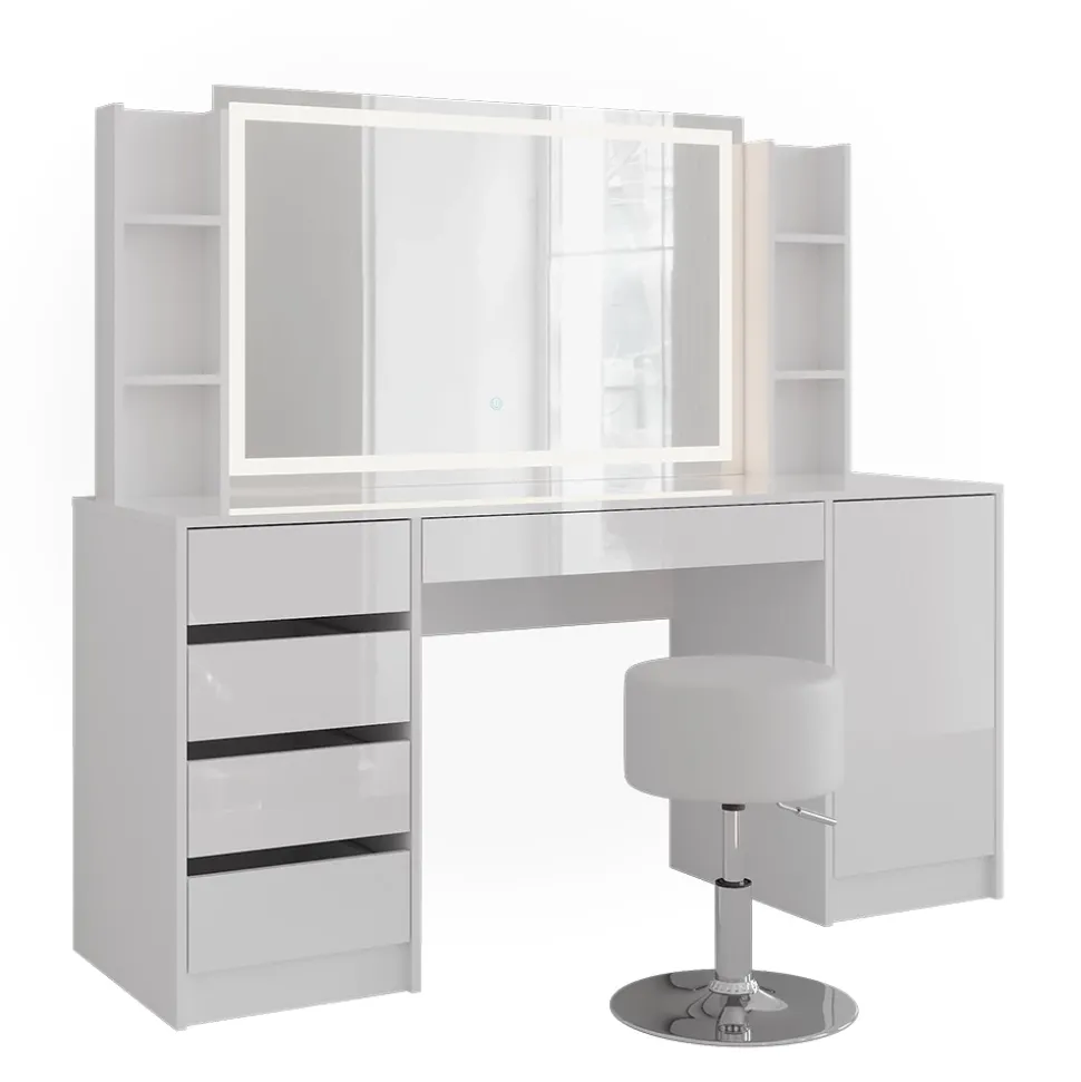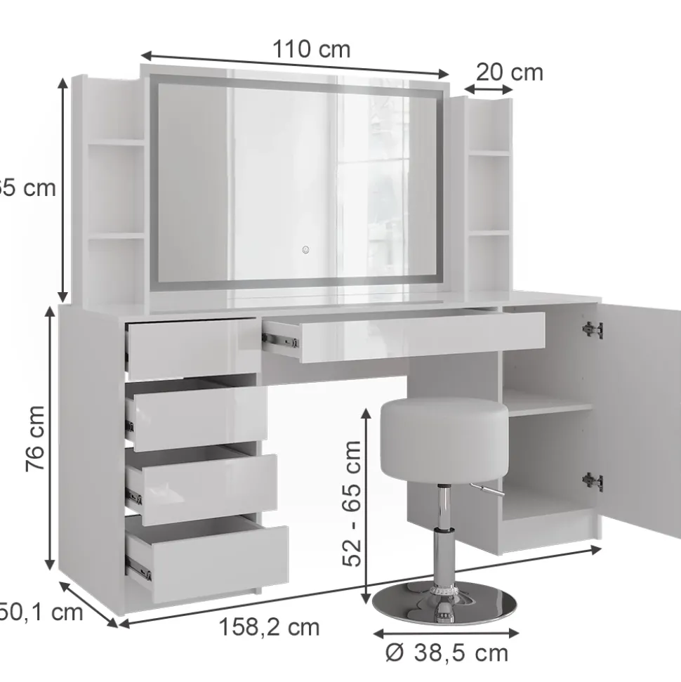 - LIEFERUMFANG: Schminktisch mit LED-Spiegel, Container mit Schubladen, Container mit Tür, Regal x2, Hocker mit Griff, Montageanleitung, Montagematerial (Dekoration nicht enthalten)