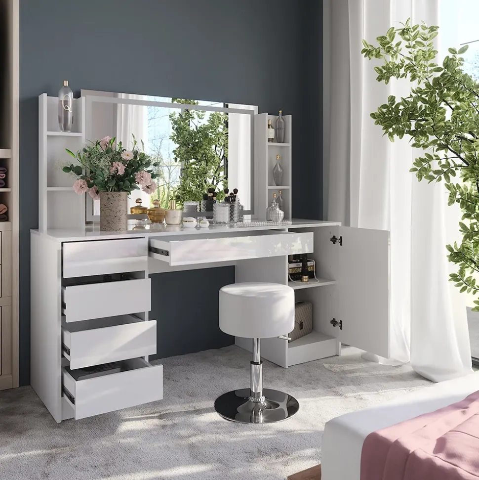 Der Schminktisch „Sherry“ vereint elegantes Design mit cleverer Funktionalität und wird im Handumdrehen zu deinem Lieblingsplatz. Ob modern, klassisch oder dezent – dank vielfältiger Kombinationsmöglichkeiten findest du genau die Variante, die wie für dich und dein Zuhause gemacht ist. „Sherry“ ist mehr als ein Möbelstück – er schenkt dir jeden Tag einen kleinen Wohlfühlmoment. Entdecke die Vielfalt und finde deinen persönlichen Traum-Frisiertisch, der Schönheit und Ordnung mit einem Hauch Luxus vereint.