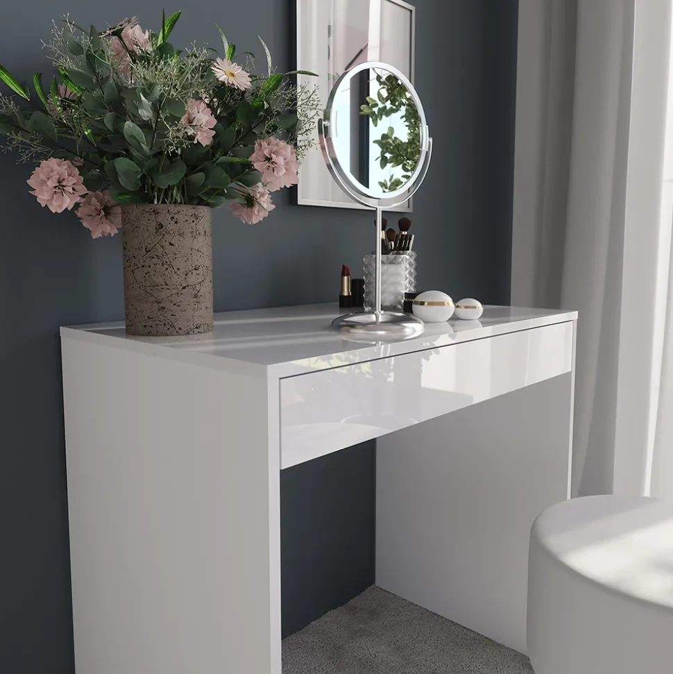 - Der Kosmetiktisch mit Spiegel verfügt über praktische Features wie integrierte Schubladen und eine Ablage für eine organisierte Aufbewahrung von Make-up und Accessoires.